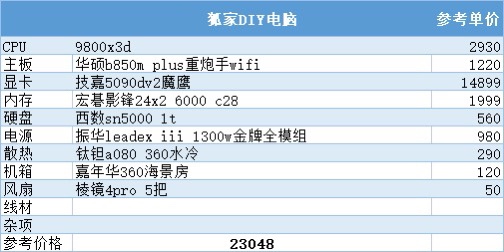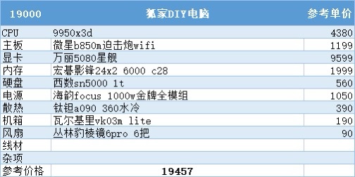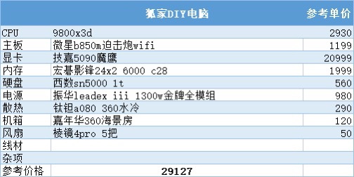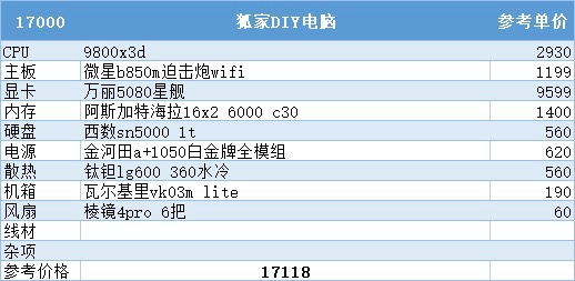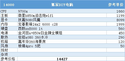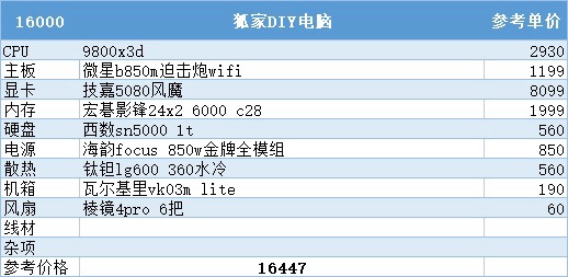 到了这个预算,9800x3d加5080安排上,目前99%游戏玩家的巅峰配置,通杀所有游戏,再往上加预算对性能的提升就不太明显了,主要还是为了个人喜好买单