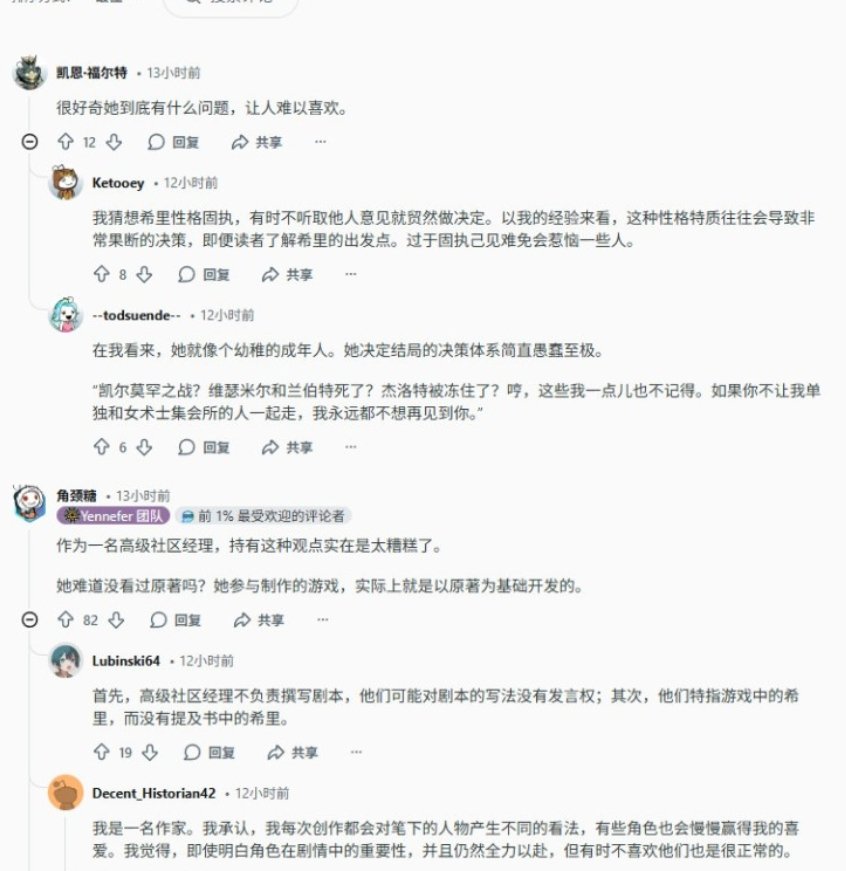 有网友在Reddit上质疑Narae是否认真阅读过《巫师》系列小说原著,认为希里在《巫师3》中展现了复杂的情感和成长历程,这正是角色魅力所在。部分玩家注意到Narae在社交媒体简介中使用“She/Her”代词后,对其观点产生了更多联想。