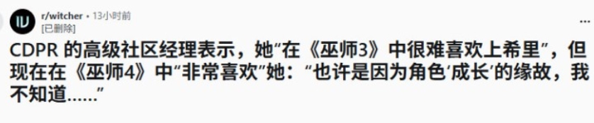 CDPR新上任的高级社区经理Narae Lee近日公开表示,她很难喜欢上《巫师3:狂猎》中的希里,但对《巫师4》中的希里形象却非常喜爱,认为这种转变或许源于“角色成长”。这一言论迅速在玩家社区中引发争议。