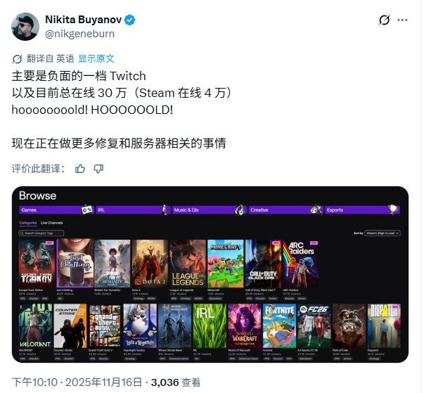 今日,制作人Nikita Buyanov宣布《逃离塔科夫》在线人数突破30万,其在Steam平台的在线人数也超过了4万。团队目前正在进行更多修复和服务器相关的工作。