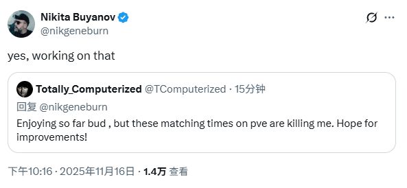 此外,尼基塔表示正在努力改善PVE模式的匹配效率。