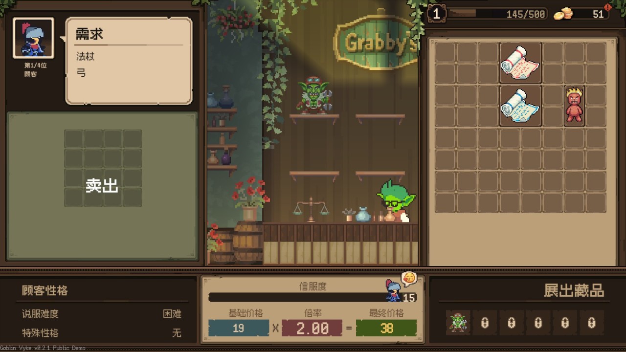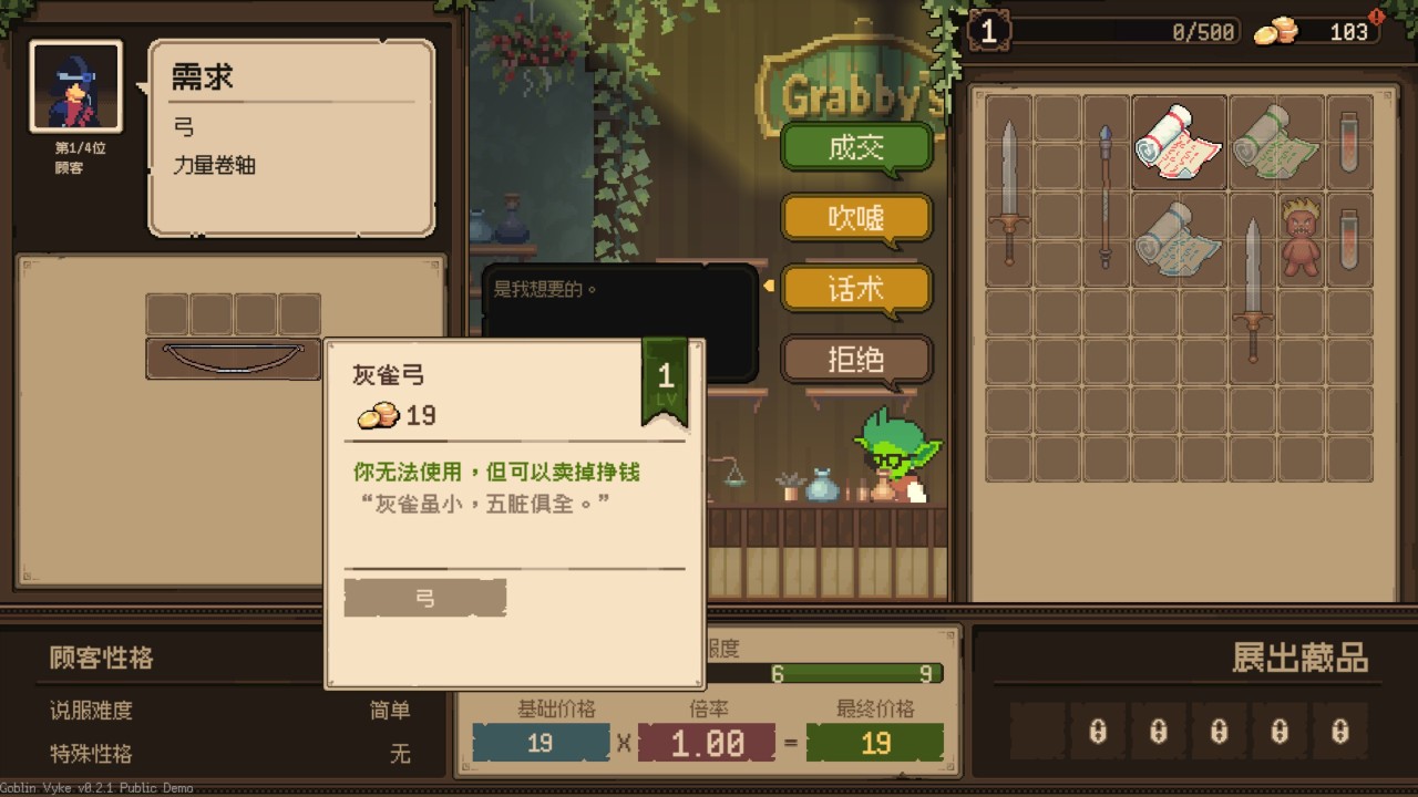 每天我们可以遇到一定数量的客人,初始是四人,每个人都有自己不同的需求,我们可以通过交谈让他们花更高的价格买下我们的东西。