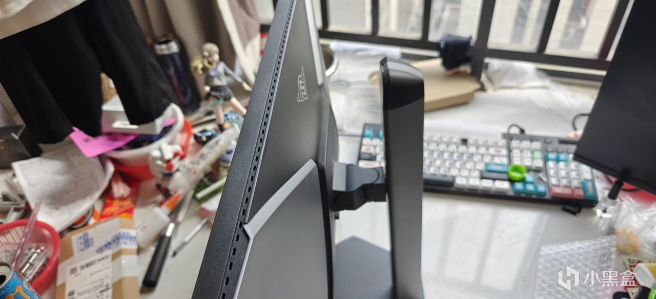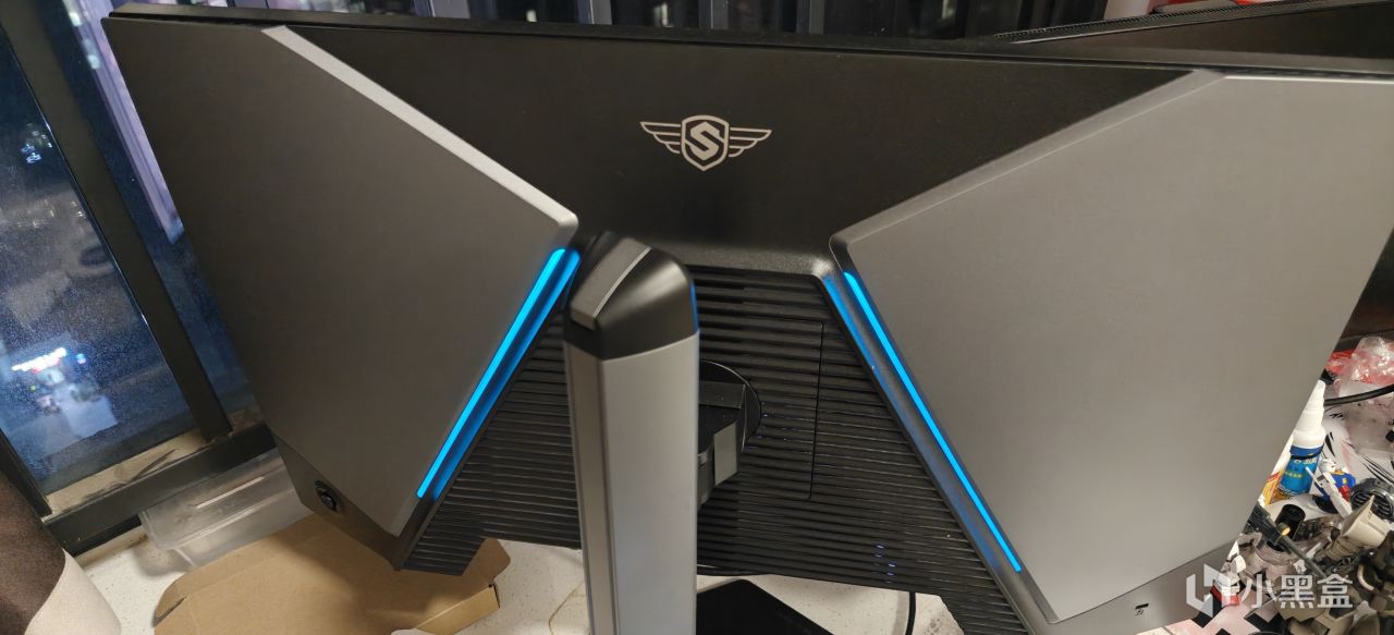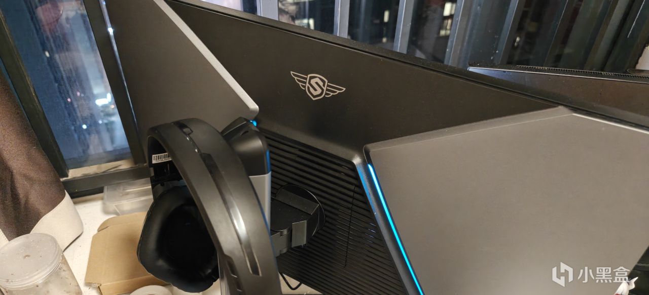 在支架的上方,轻松拨动还有一个小挂钩,可以用来放置耳机。虽然平时耳机使用完都是随便一放,不过可以不用,不能没有。多一点总归是好的。来看显示器本体,正面的左下角标注了显示器的几个特点“2K360Hz、专业电竞调节、感应灯”。
