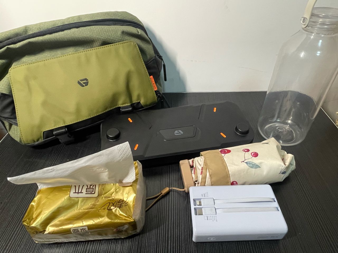 這裏就放我的雨傘、充電寶、水杯、NS2、紙巾、耳機啦