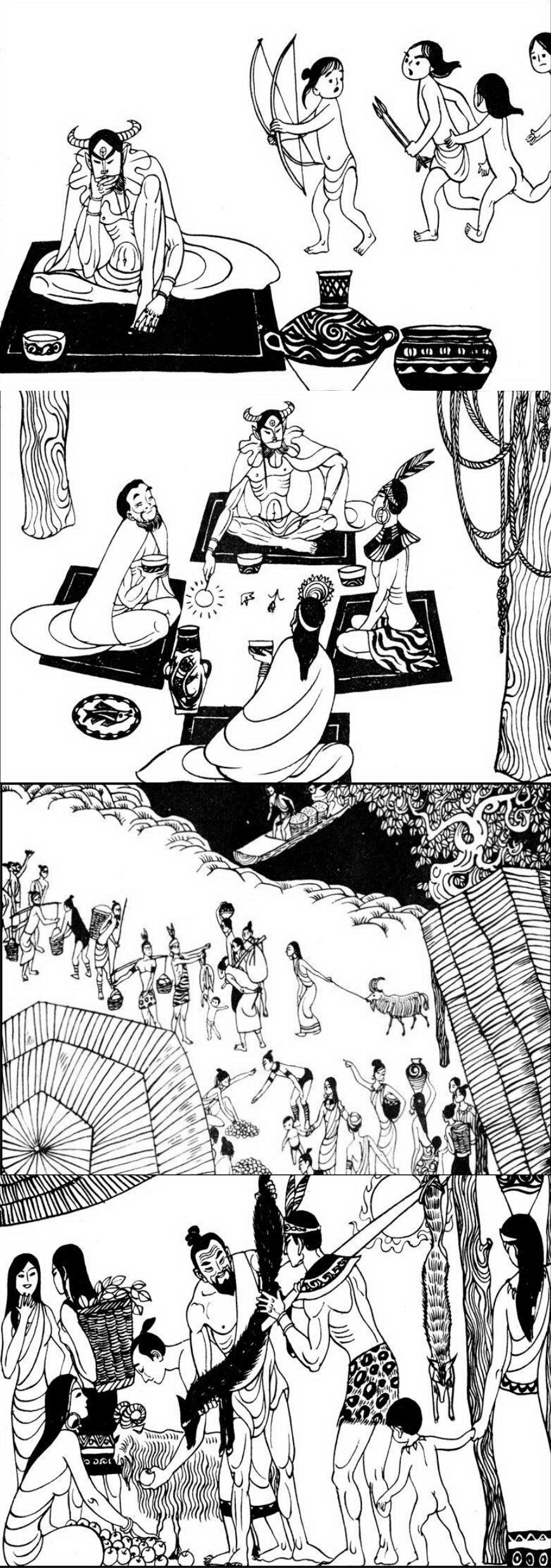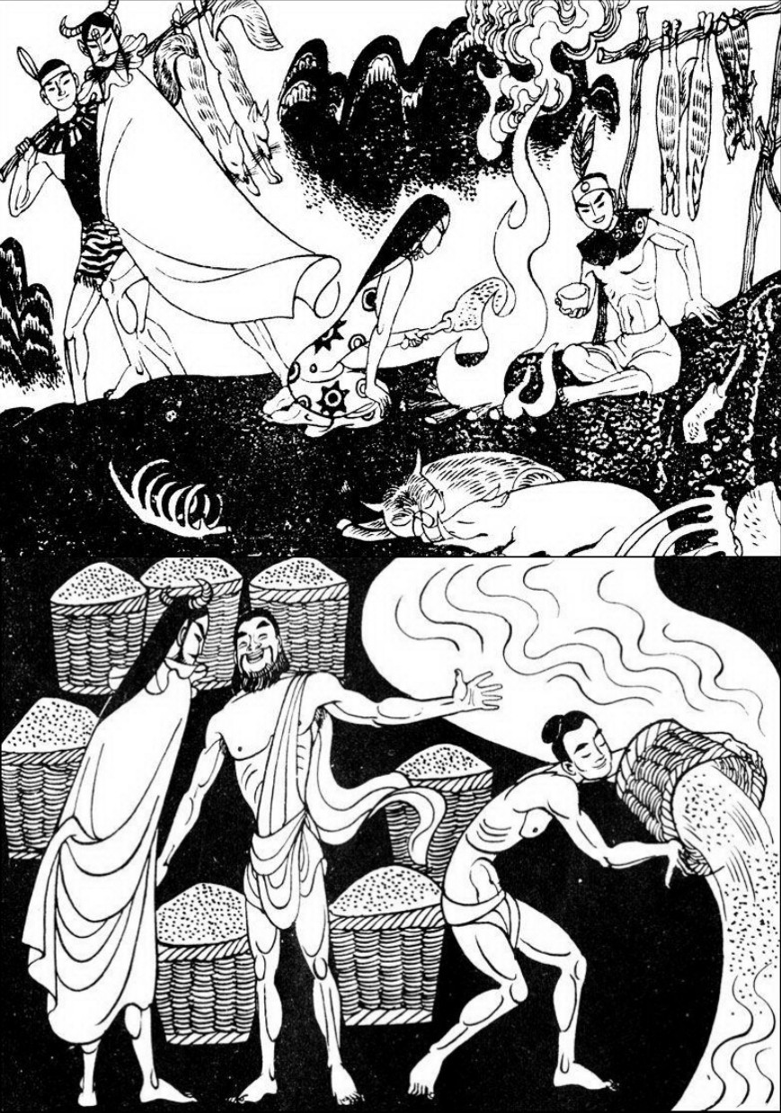 某天,神農發現靠近山林的部落善於捕獵,肉喫不完,隨意丟棄。而另一個部落,穀子高粱也是喫不完只好倒入河裏。神農覺得既浪費又可惜,那個部落的人卻說有啥浪費的,明年又是滿滿的收穫。
