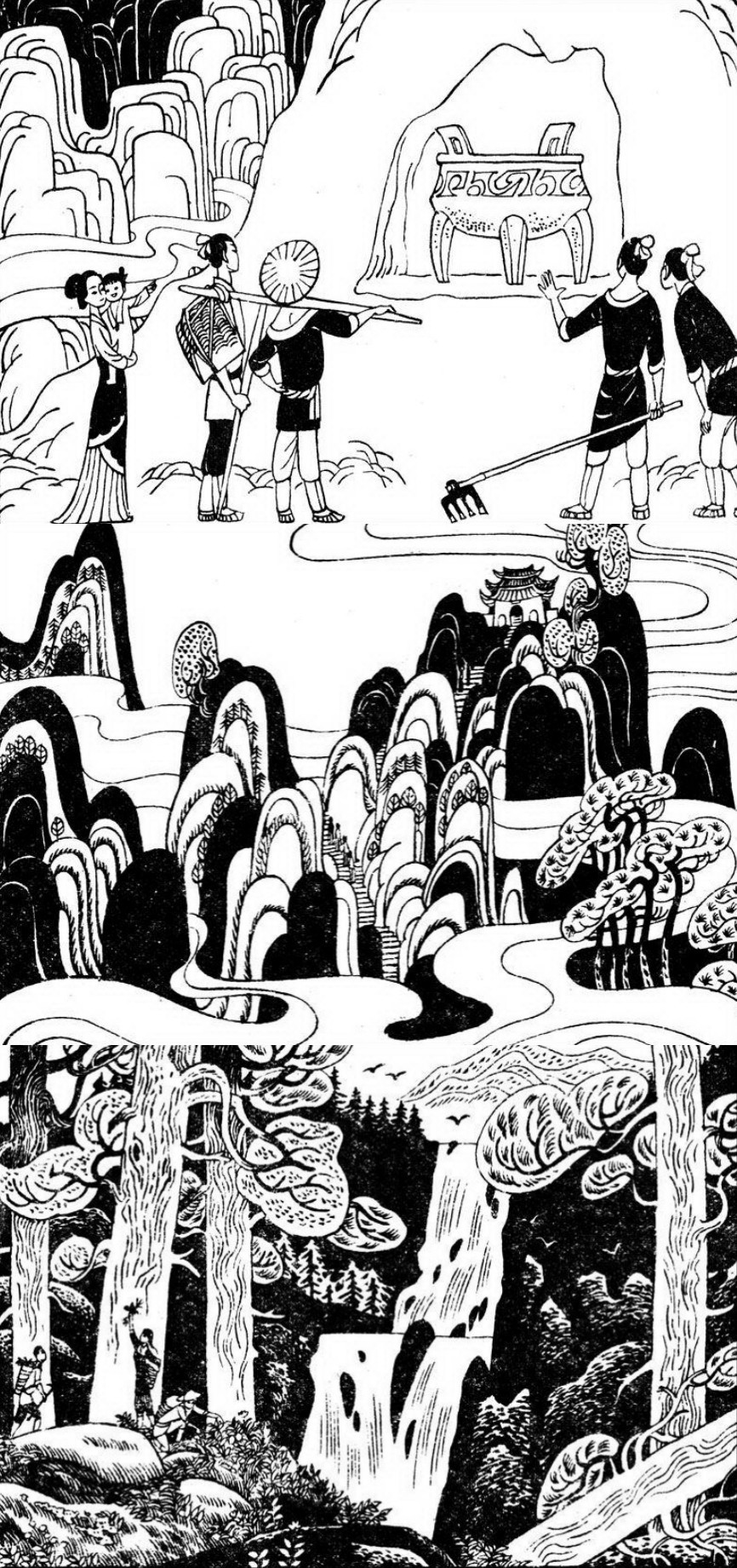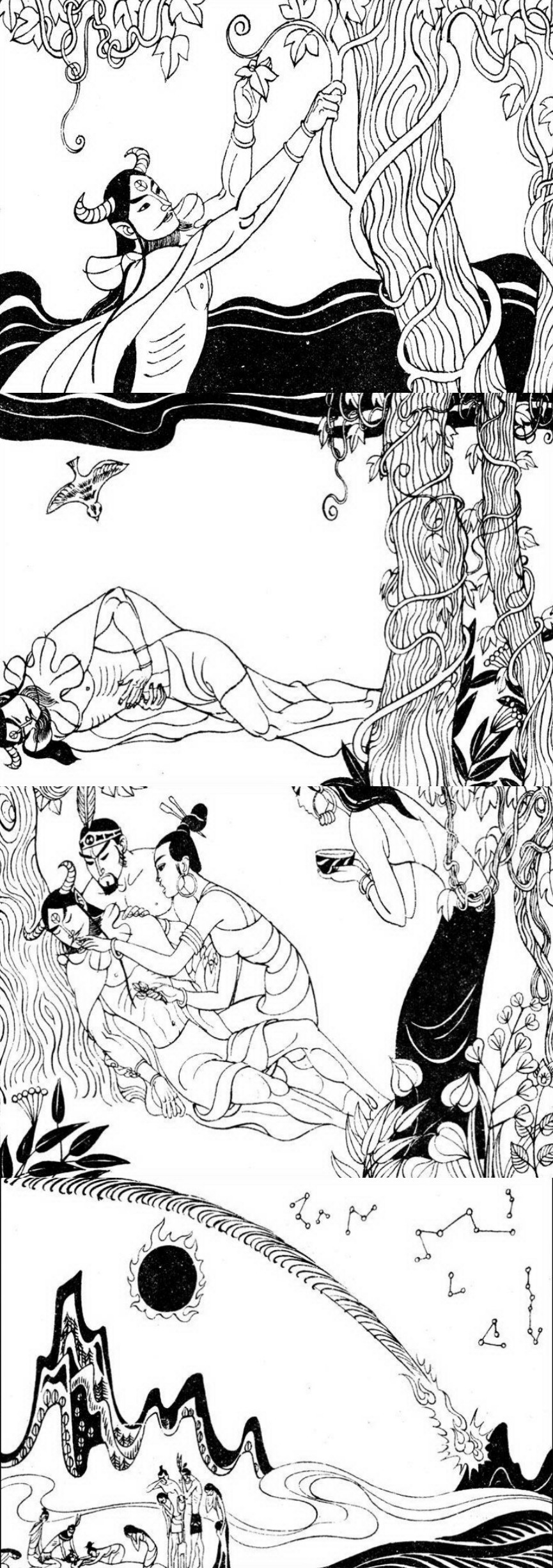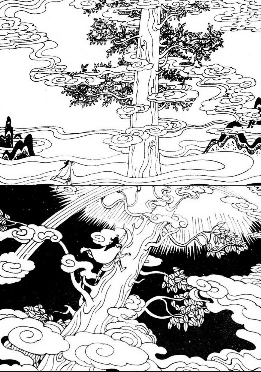 神農決定爬建木上去,這真是一棵參天大樹,高聳入雲,他也不停地爬,爬上了雲間。