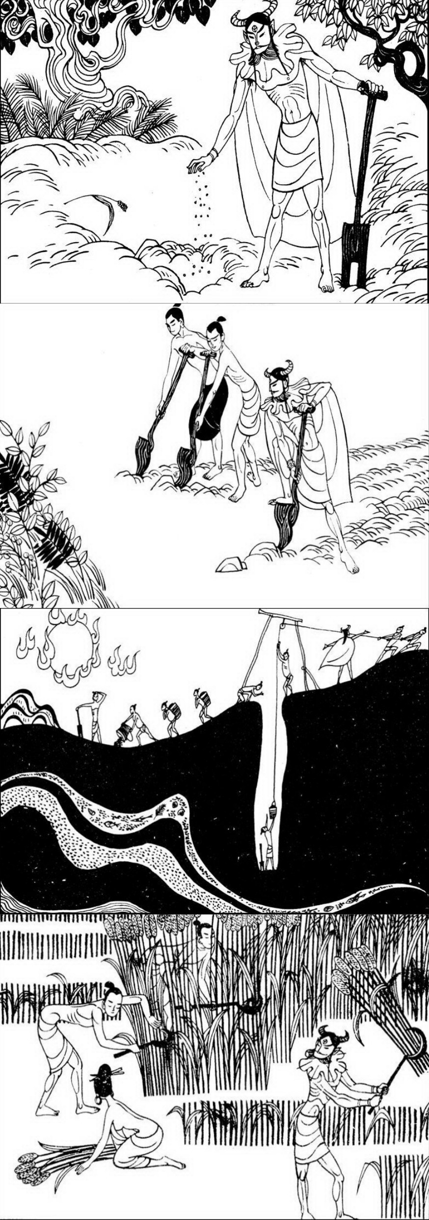炎帝覺得這是天帝派神鳥來給他送的種子,就把種子種入了田裏。他又用木頭做成耒耜來臿土,告訴大家將土弄碎,更容易讓種子生長。也讓大家儘量多挖掘井,有水才能讓田地更好的得到灌溉。到了秋天,禾苗大豐收,人們感激炎帝,後來改稱他爲神農。