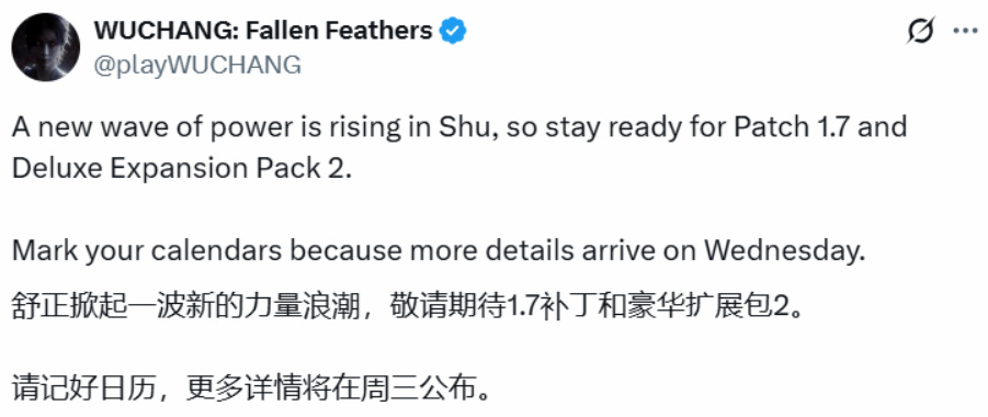 国产动作游戏《明末:渊虚之羽》官方近日发布重磅预告,宣布游戏即将迎来1.7版本补丁与豪华扩展包2,官方特别提醒玩家标记日历,并明确更多更新细节将于本周三正式公布。这款上线后持续迭代的作品,此次更新能否再添新亮点,玩家已充满期待。