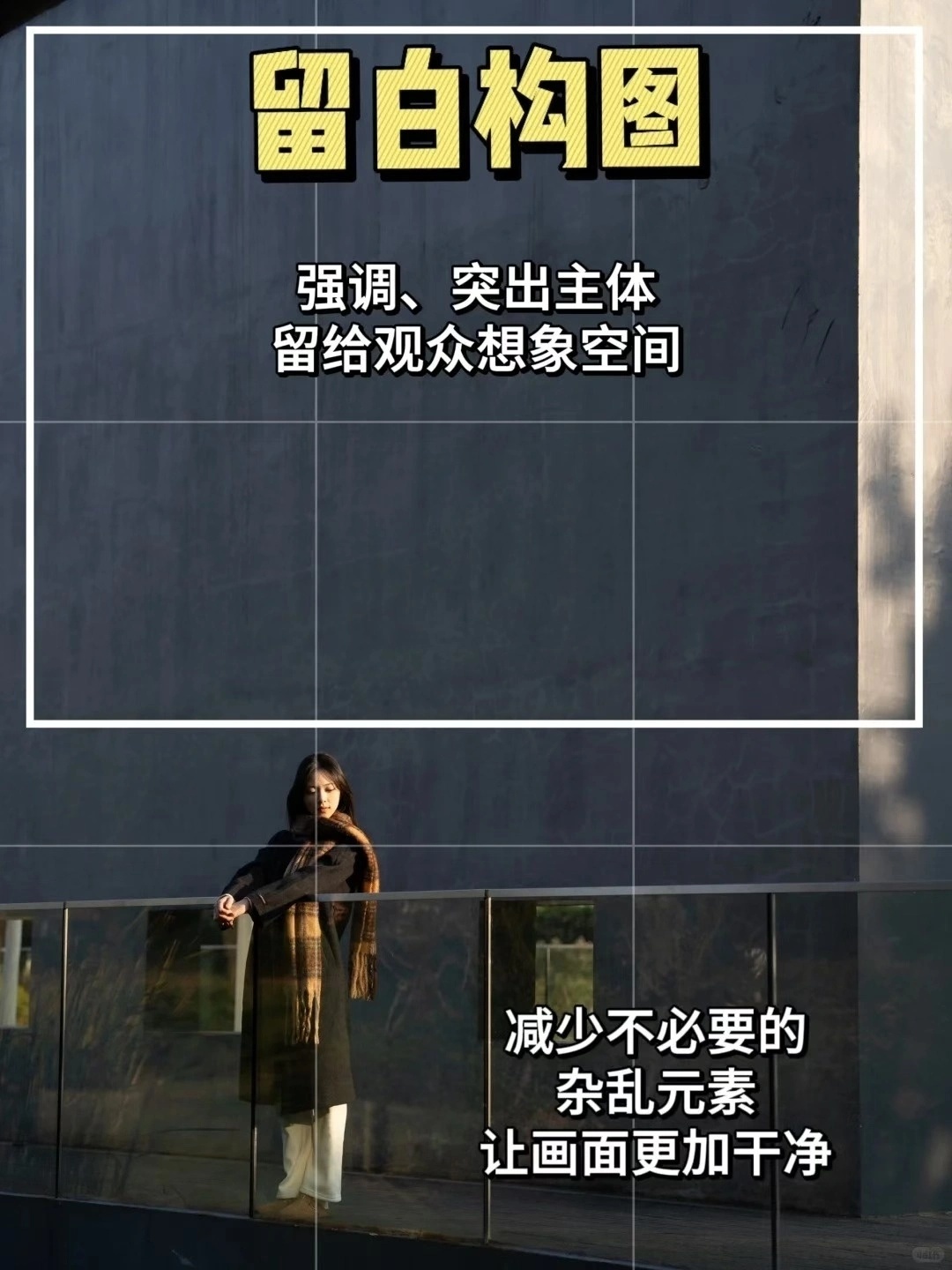 1. 留白構圖:主體佔1/3,背景選純色(街拍/純色牆);