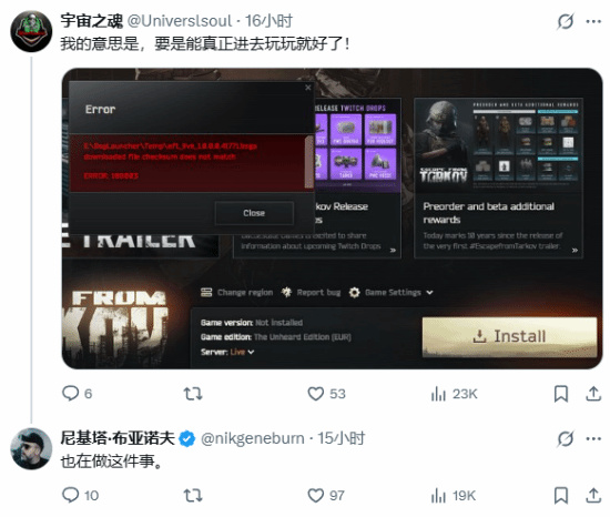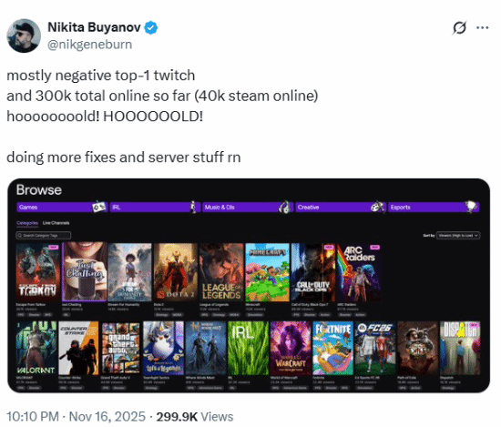11月16日,《逃离塔科夫》的游戏总监尼基塔·布亚诺夫在个人推特上发文:“我们《逃离塔科夫》成twich第一游戏了!(虽然都在骂)”