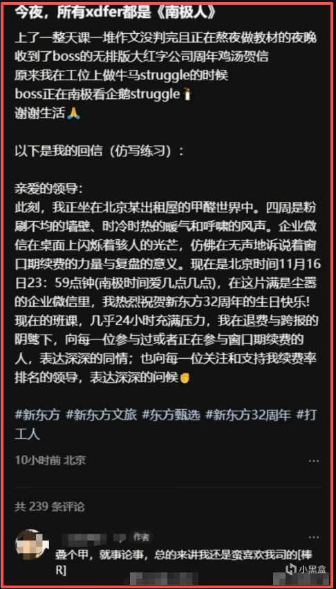一则员工公开吐槽老板的消息近期引发热议。新东方成立 32 周年之际,创始人俞敏洪在南极发布内部信,信中 5 次提及南极,还为新东方、东方甄选定下发展基调,却意外引发部分员工不满,一句 “本来加班就烦” 的吐槽迅速冲上热搜。