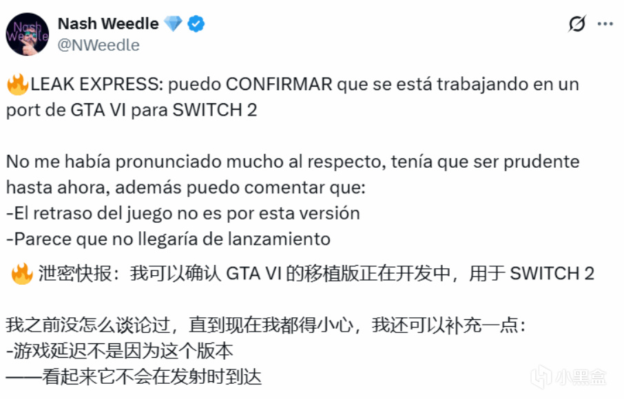 爆料人Nash Weedle近日投下重磅消息,确认Rockstar正为任天堂新主机Switch 2开发《GTA 6》移植版,Nash Weedle在社交平台澄清两大关键信息:《GTA6》此前延期与Switch 2版开发无关;尽管项目已启动,移植版不会随新主机首发,玩家需耐心等待。值得一提的是,他曾准确爆料《艾尔登法环》NS2 版本,可信度有迹可循。