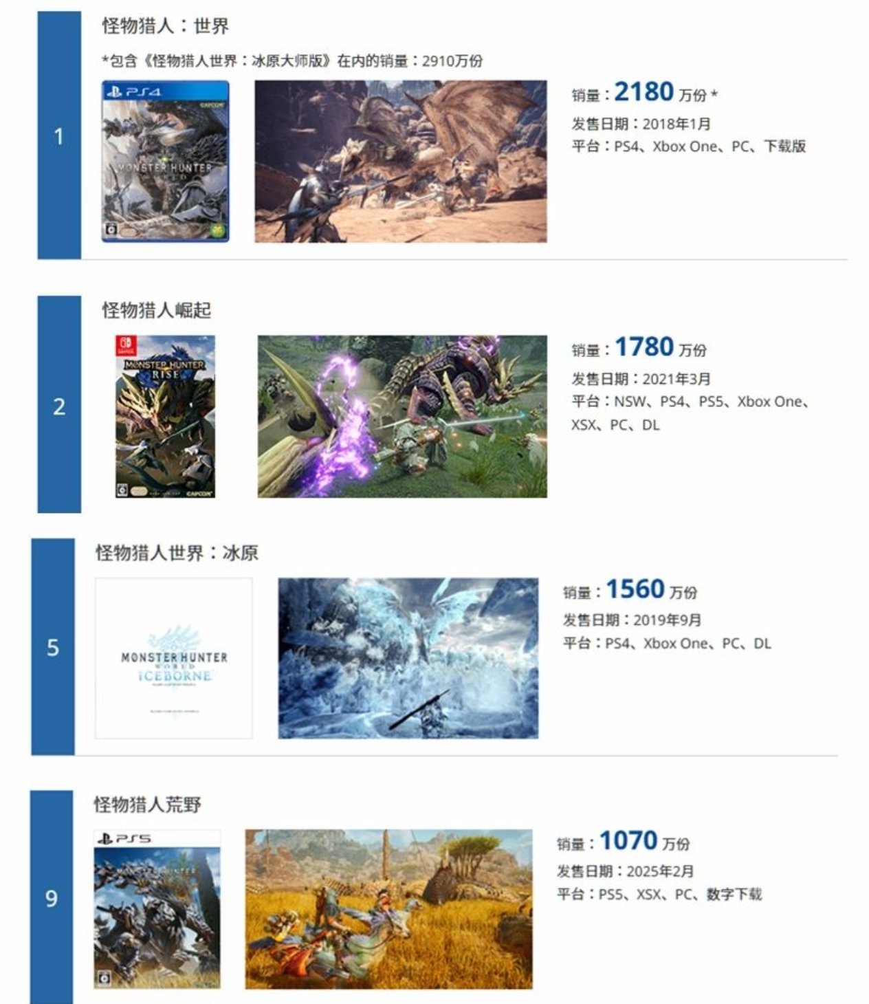 《怪物猎人:崛起》以1780万份的销量位列第二,《怪物猎人世界:冰原》DLC单独销量也达到1560万份,排名第五。系列最新作《怪物猎人:荒野》销量为1070万份,本季度新增20万份,目前排名第九。《怪物猎人:世界》于2018年发售,凭借开放世界设计、画面提升及多平台发行策略,成功将系列影响力从日本掌机市场扩展至全球,成为卡普空迄今为止最畅销的单部作品。
