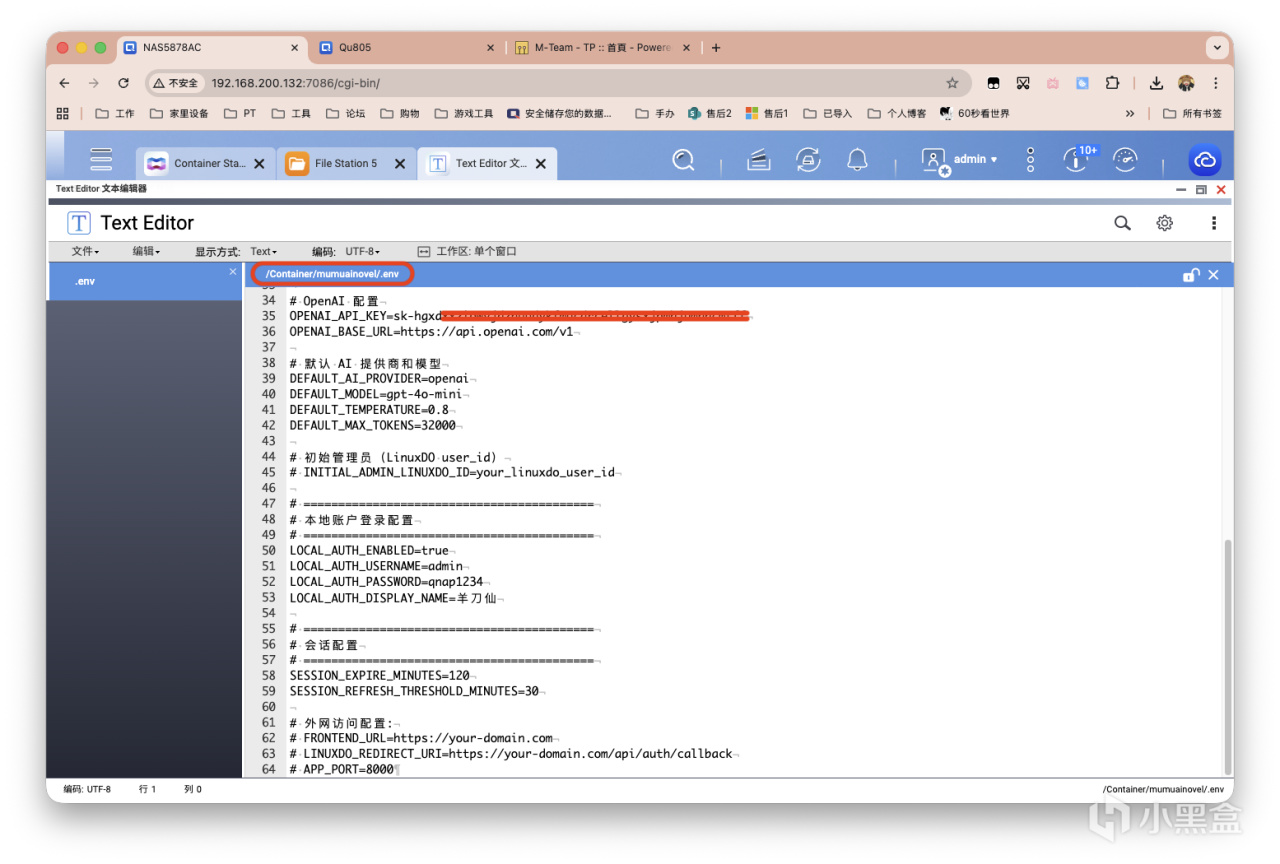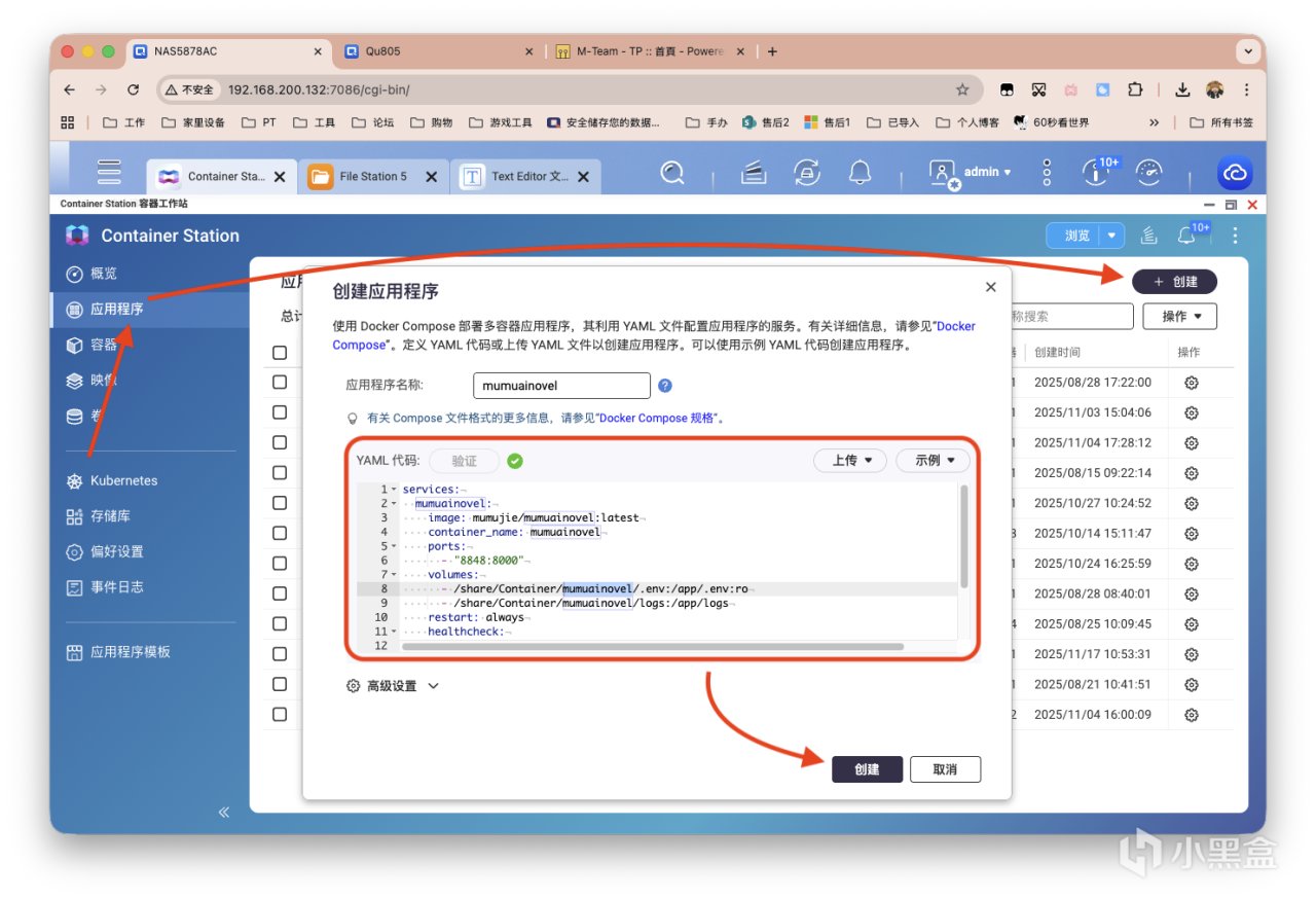 将环境变量部分进行修改。修改完后别忘记改名!我威联通NAS的Docker常用路径下创建该项目专用文件夹,路径为/share/Container/mumuainovel。