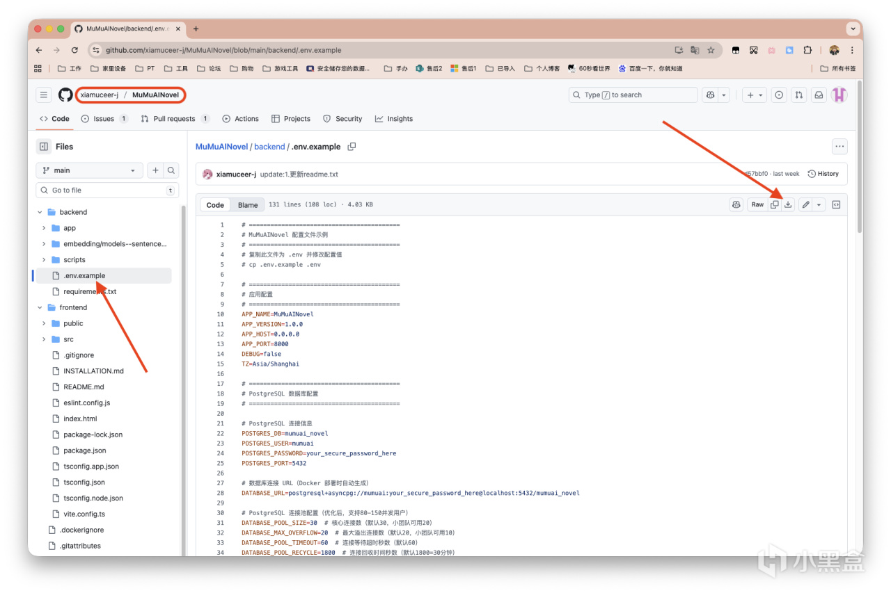 其次准备一个.env环境变量文件,放在提前准备好的目录下。这个文件可以到项目地址下载,完整项目名:xiamuceer-j/MuMuAINovel。