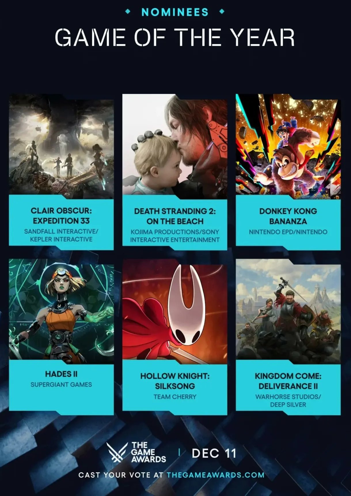 他们分别是《33远征队》《死亡搁浅2》《咚奇刚》《哈迪斯2》《丝之歌》《天国拯救2》