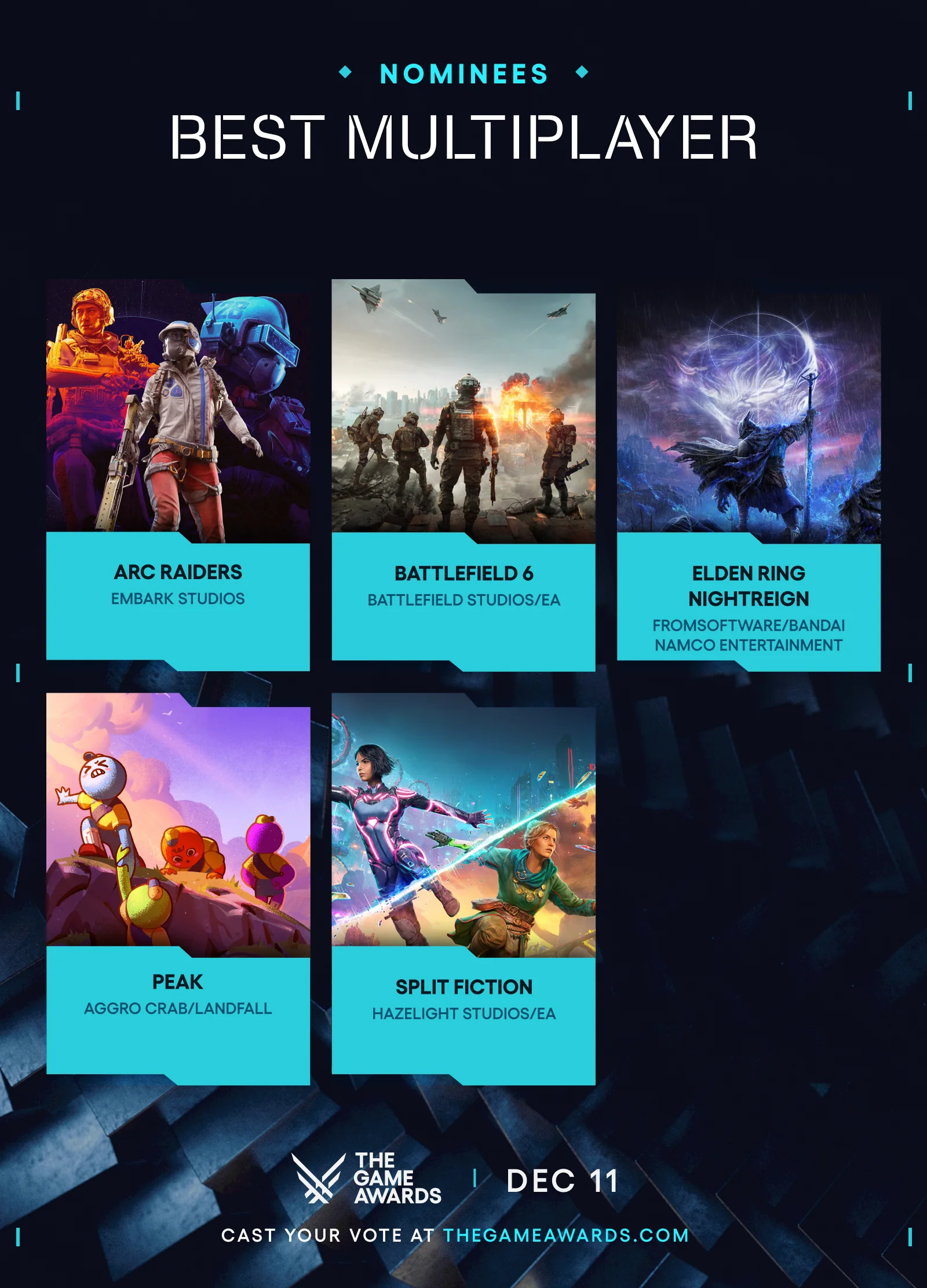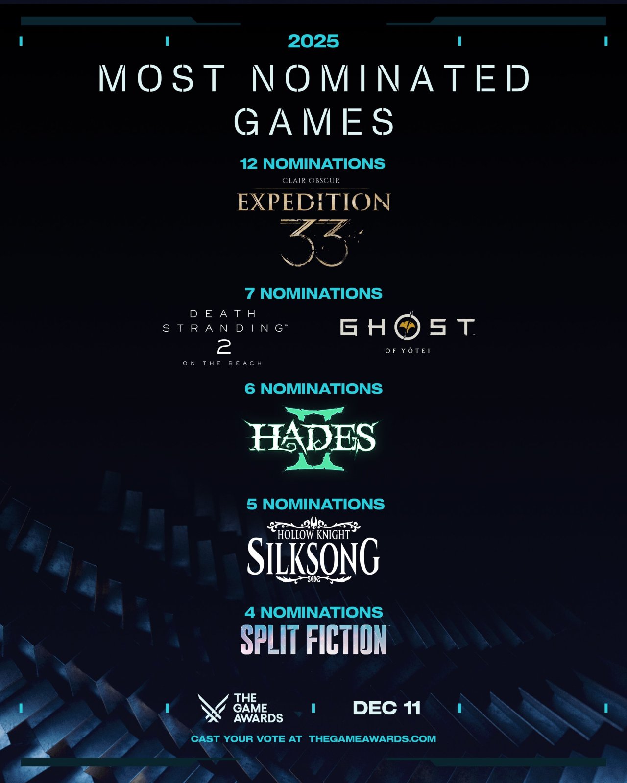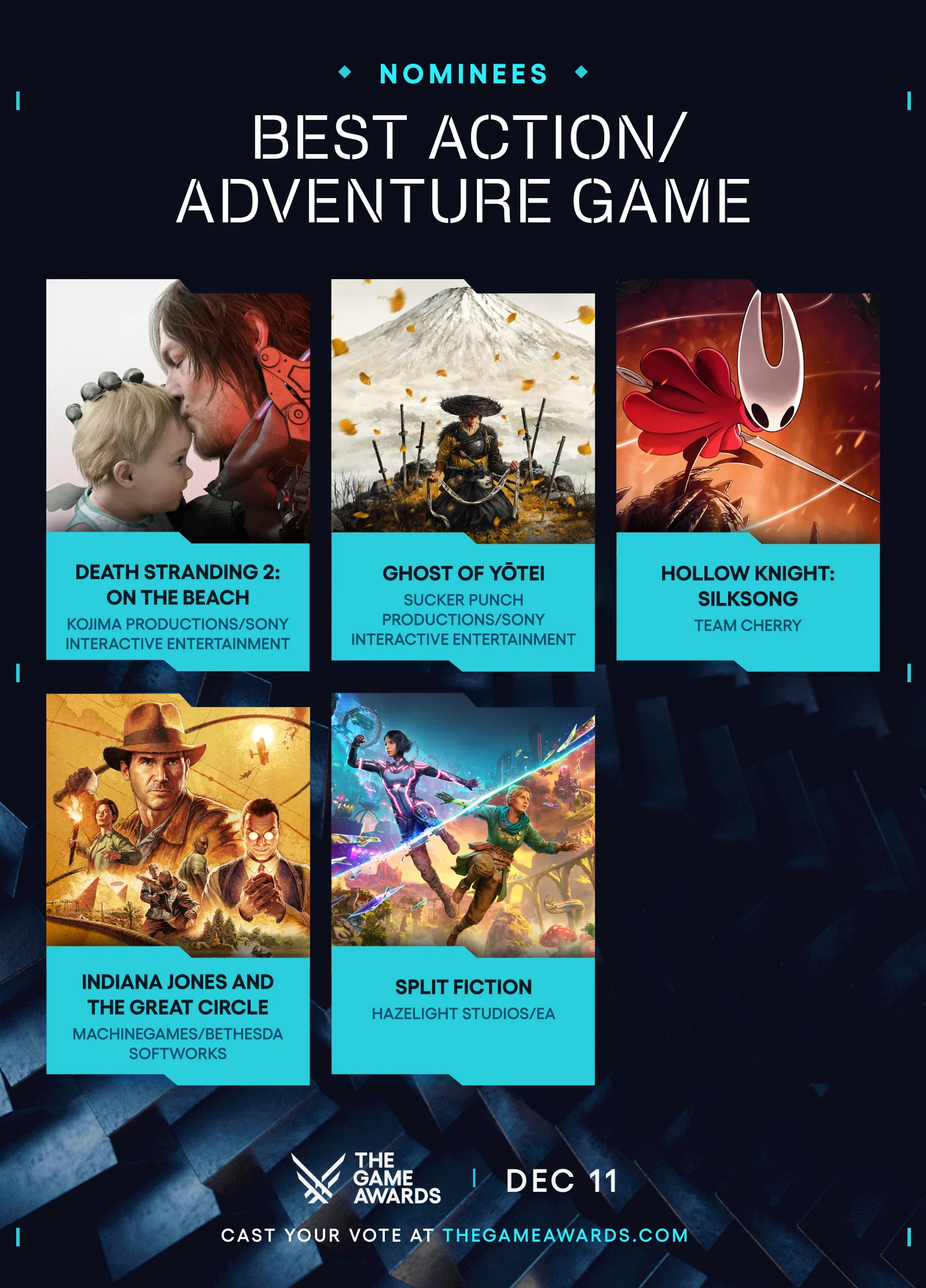 The Game Awards(TGA)是由加拿大籍遊戲媒體人傑夫·吉斯利主辦並主持的電子遊戲獎項,以表彰全球過去一年內發售的優秀電子遊戲。其中,“年度最佳遊戲”被視爲電子遊戲產業中最爲重要的榮譽之一。