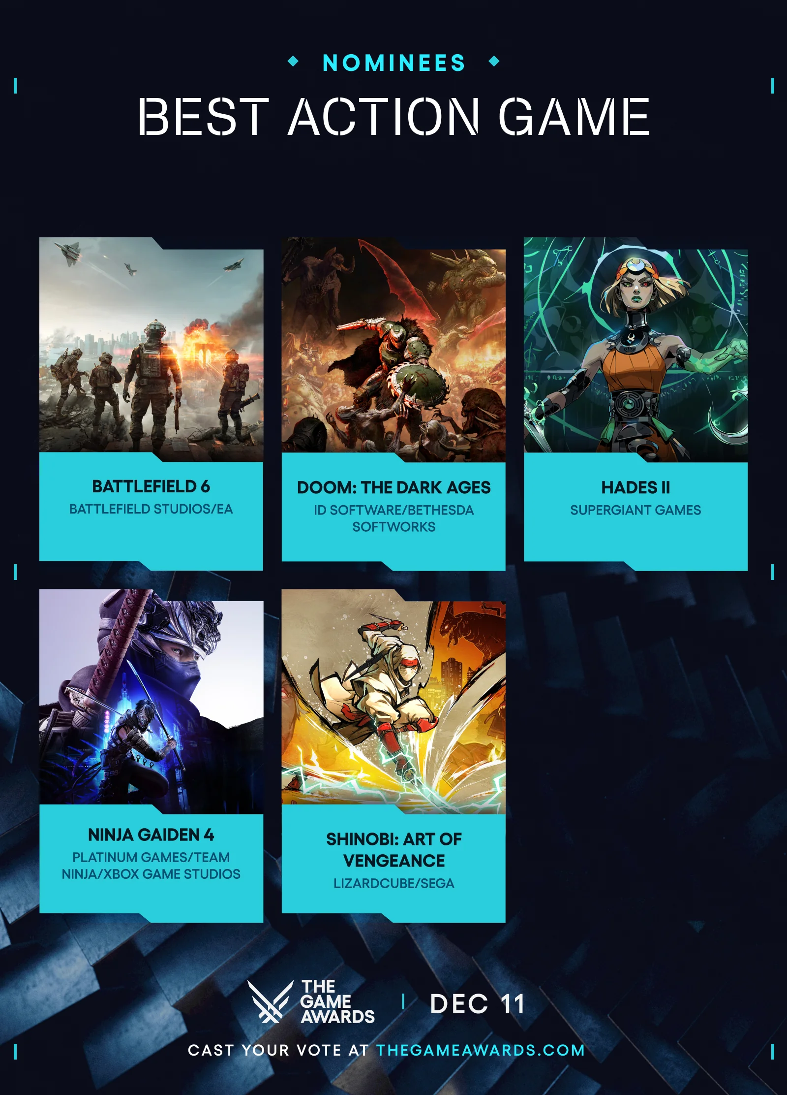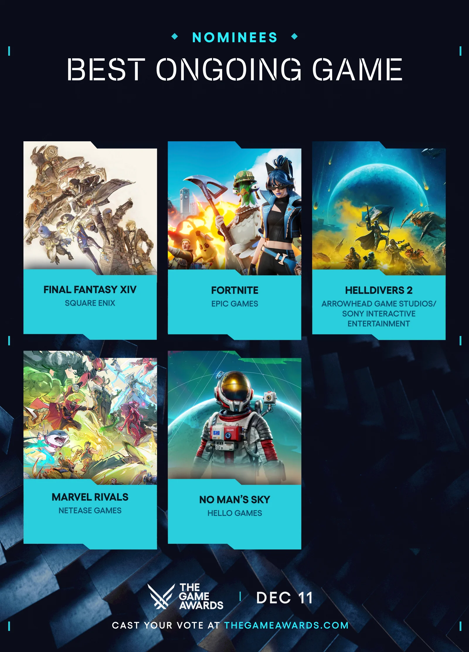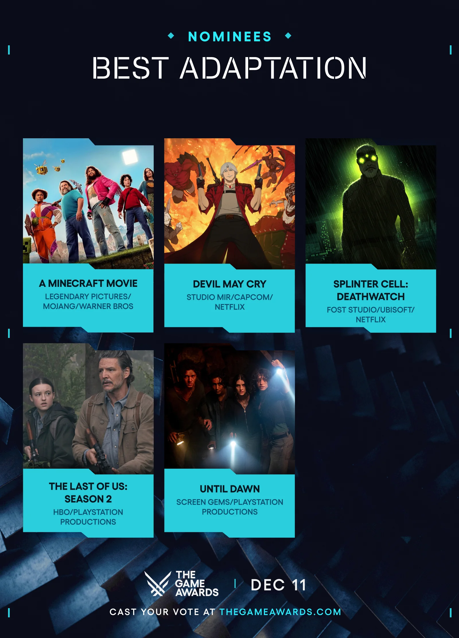 The Game Awards(TGA)是由加拿大籍遊戲媒體人傑夫·吉斯利主辦並主持的電子遊戲獎項,以表彰全球過去一年內發售的優秀電子遊戲。其中,“年度最佳遊戲”被視爲電子遊戲產業中最爲重要的榮譽之一。