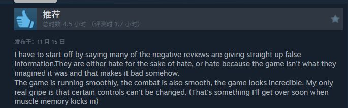 有玩家在社交媒体上直言:“是的,这是一款免费游戏。但为什么市值数十亿美元的大公司却做不出这样的作品呢?”游戏在Steam上的好评率呈现上升趋势,从开服时的约50%攀升至70%“多半好评”。许多国际玩家在评测中赞扬游戏运行流畅、战斗体验顺滑、画面惊艳。一位玩家评论道:“中国开发者一如既往地为我们带来了一款精彩的游戏。”还有人表示“作为免费游戏来说它真的很精彩”,并对游戏中深厚的中国文化元素表现出浓厚兴趣。