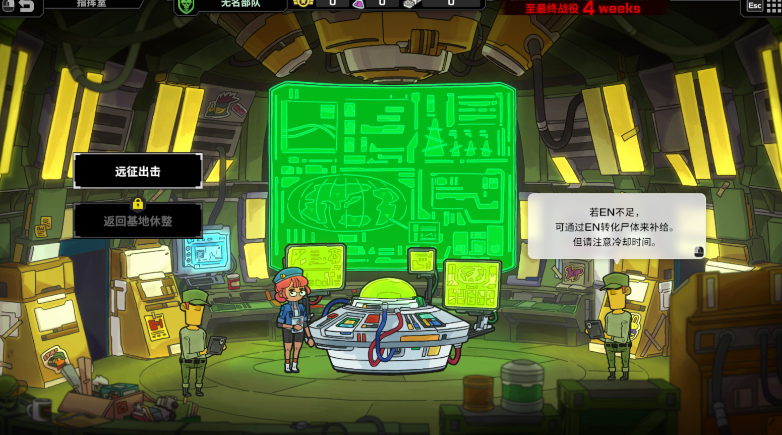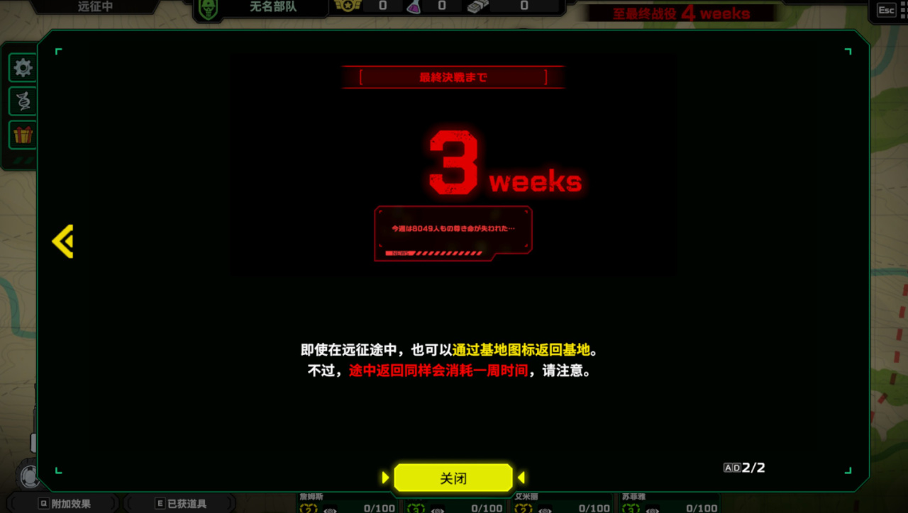 遠征途中,你可以直接返回基地進行休整,但這樣也會消耗一週時間。