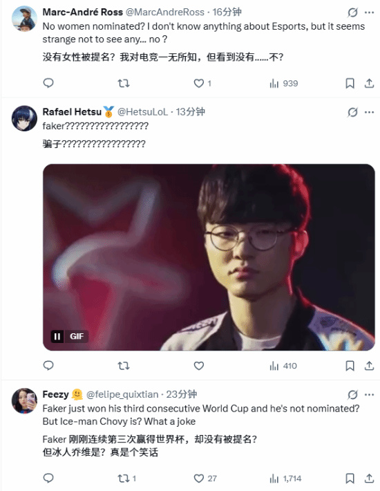 国外玩家在评论区表示,没有Donk,没有Faker,没有女性,TGA含金量再次被质疑。