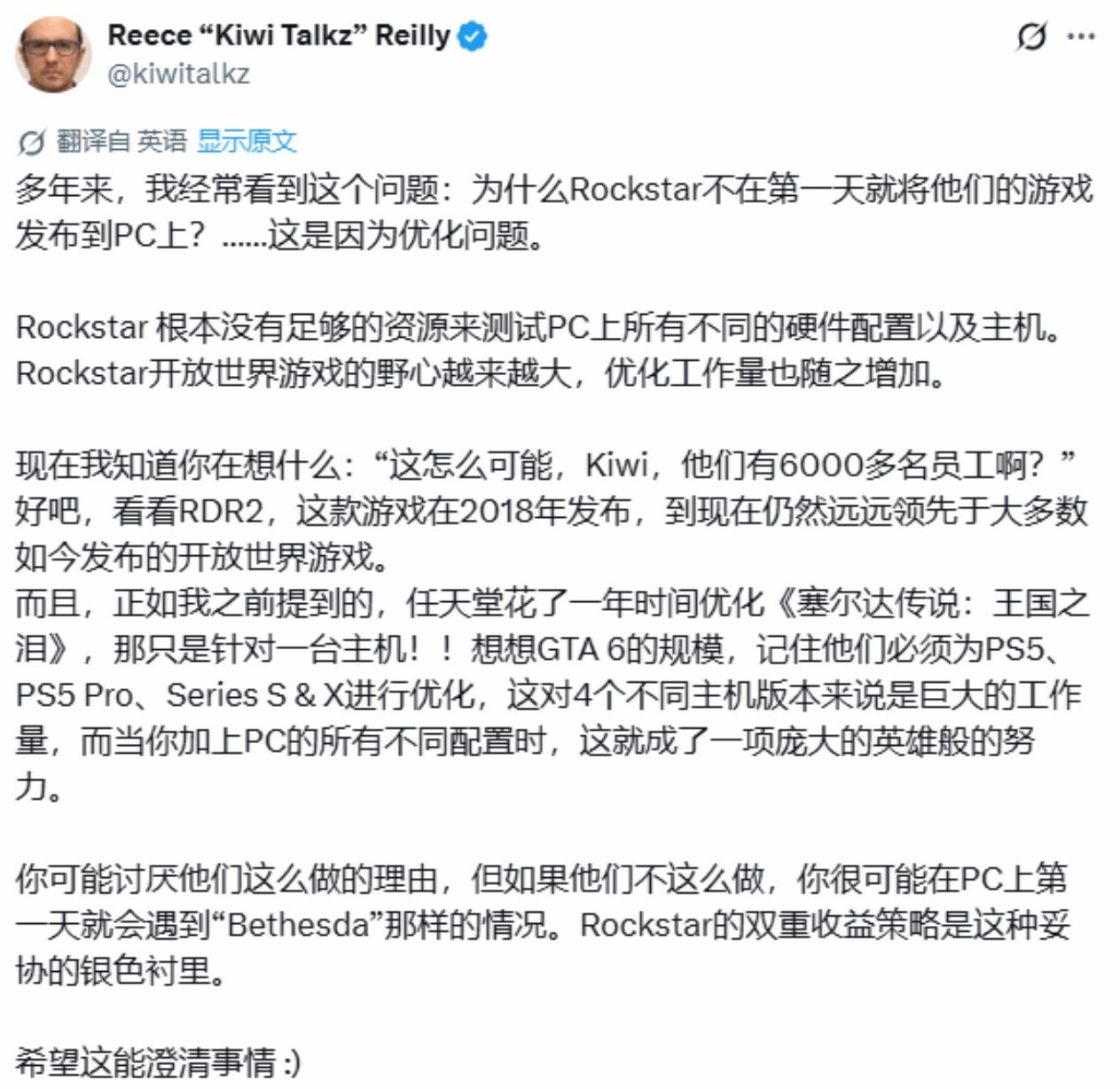 有分析顯示,Rockstar開放世界遊戲的野心不斷擴大,優化工作體量隨之增加。Kiwi Talkz坦言,若不採用這種模式,PC端首發可能會陷入類似B社遊戲的窘境。