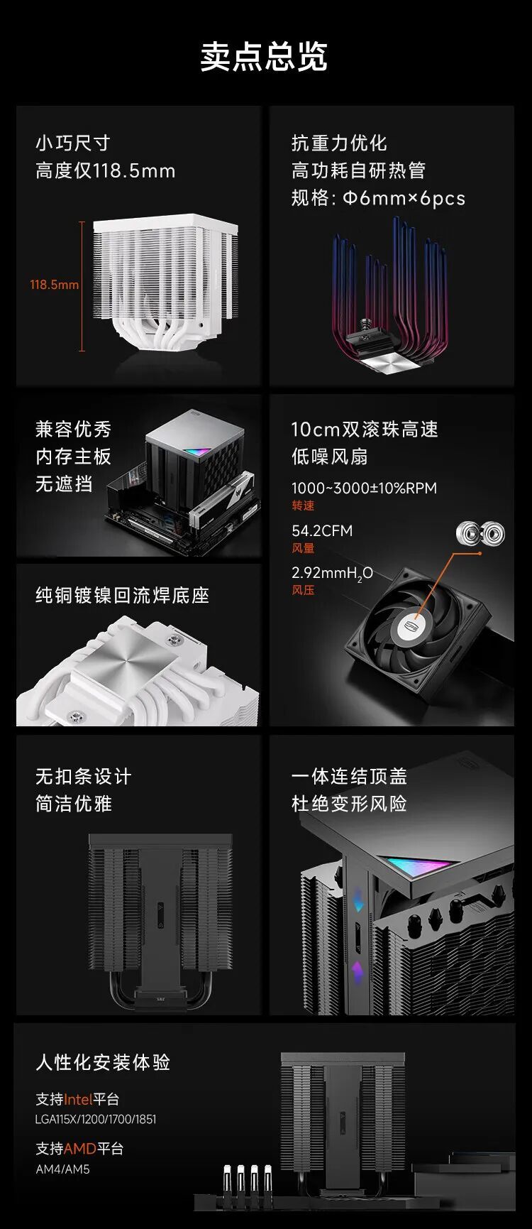 据介绍,这款散热器采用简约一体化外观,高度为 118.5mm,兼容各种小型机箱,可适配各种高度及槽位的内存,确保兼容性,顶部拥有家族化 ARGB 光区点缀,采用双塔式架构,内置一体式连接顶盖,增强整体结构稳固性。