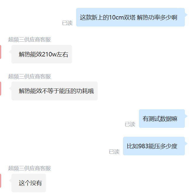 帮大家问了,解热210W,但是没有测试数据。另外虽然风扇风压足够,但是单把风扇吹双塔是不是有点太抠门了。