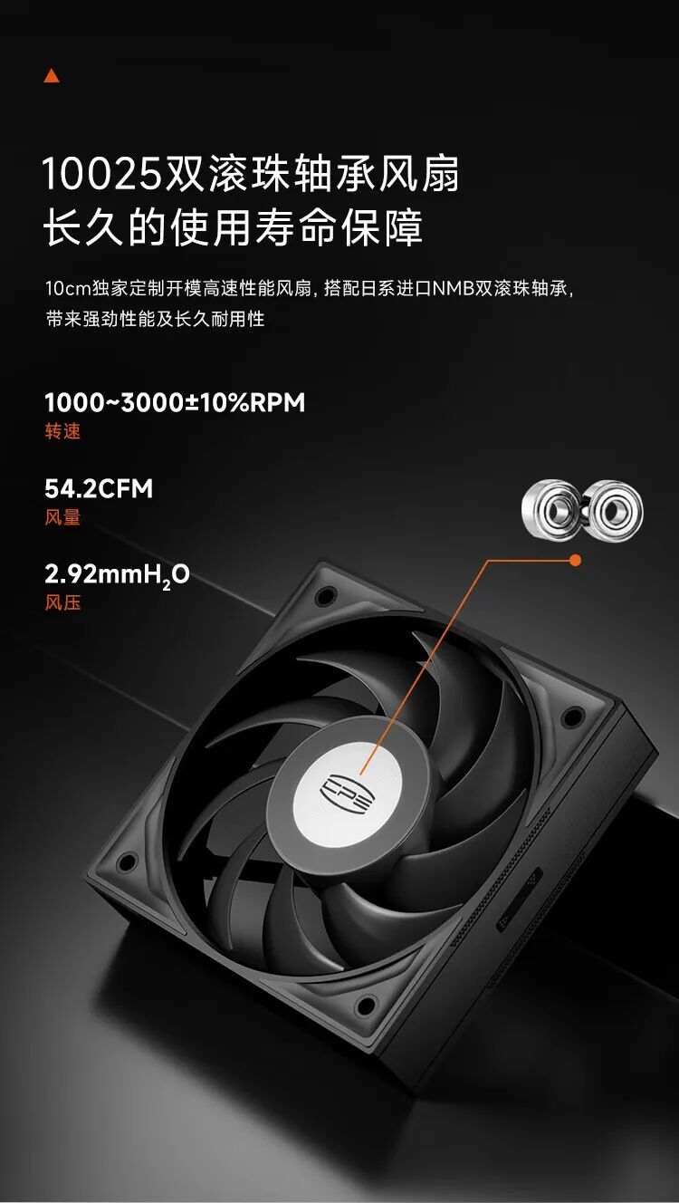 硬件方面,这款散热器拥有自研高功耗热管,规格为 6mm*6pcs,可兼容水平或垂直安装,内置三角几何鳍片矩阵,可有效减小气流阻力,降低风噪杂音,自带 10025 双滚珠轴承风扇,配备日系进口 美蓓亚*** 双滚珠轴承,转速范围可达 1000-3000±10% RPM,采用 10cm 独家定制设计。