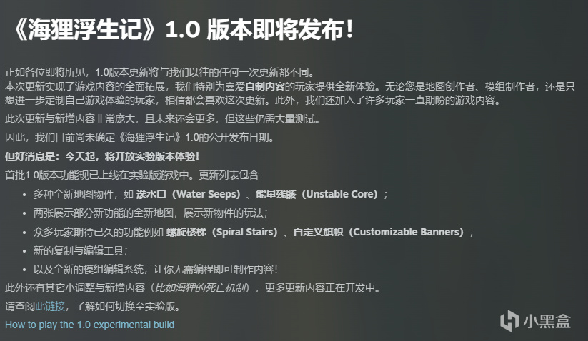 该游戏在历经4年的抢先体验后,总算是快要出1.0正式版了,目前已有实验性的1.0版本发布,我先来替各位品尝一下~
