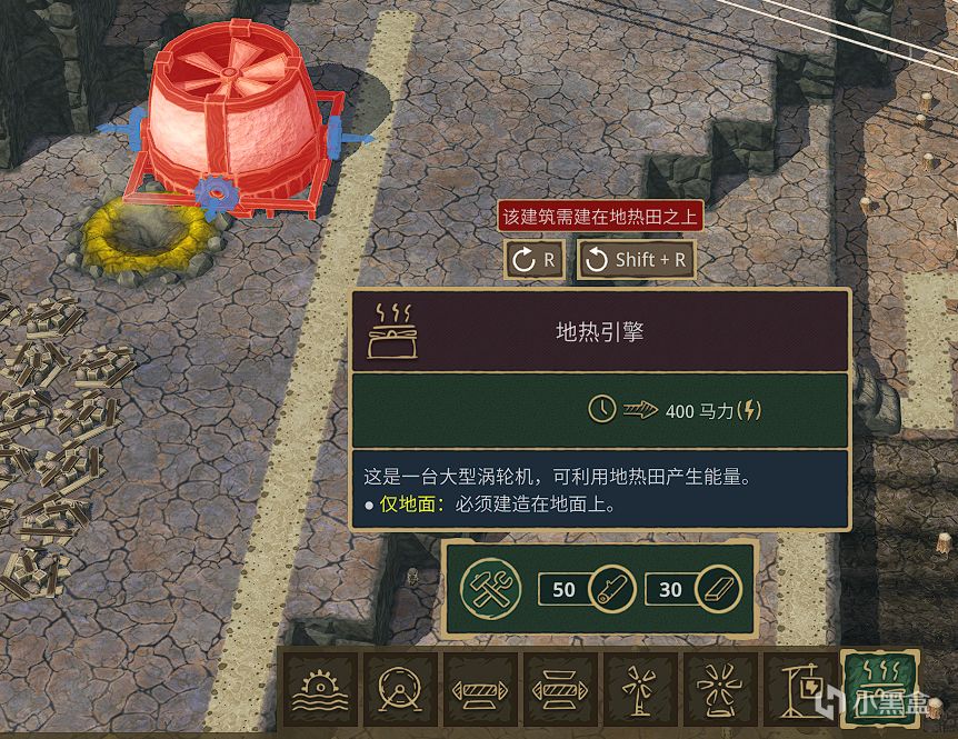 水利建筑一旦停摆,那么海狸们就只能干瞪眼发呆了,不过这次实验性1.0版本为玩家带来了极其好用的设施“地热引擎”。需要玩家先找到地图上的黄颜色的“地热区”,随后便可以在此之上建造地热引擎了,这个设施属于目前的最强动力装置,不需要用到水,也不需要用到风力,全天候不间断供应能量!