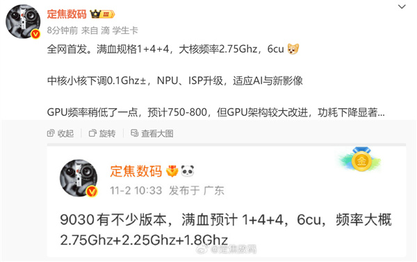 按照博主的说法,麒麟9030满血规格是“1+4+4”核心,大核频率2.75Ghz,中核小核下调0.1Ghz±,NPU、ISP升级,适应AI与新影像。