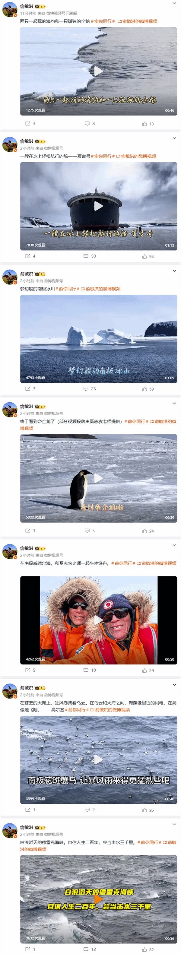 新东方董事长俞敏洪因南极纪念信引发员工吐槽后,11月18日上午在社交平台连续发布8条南极游视频。视频内容涵盖南极日出、帝企鹅、海豹、冰川景观以及乘坐冲锋舟的场景,并配文“自信人生二百年,会当击水三千里”等诗句。