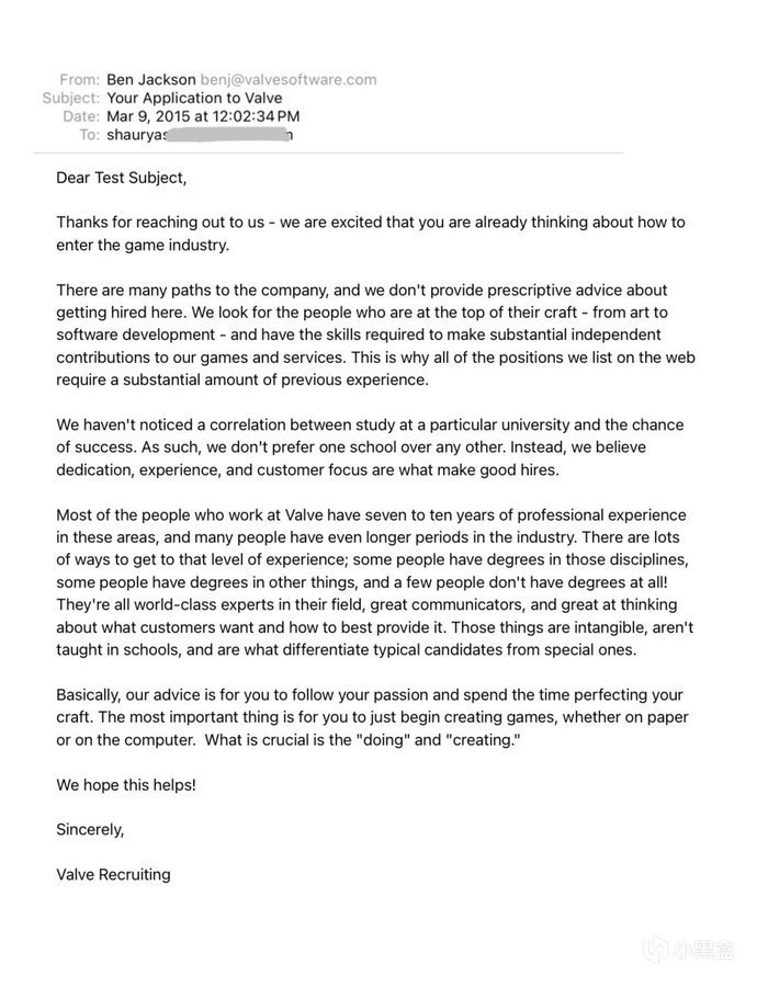 從 Seth 分享的回信來看,Valve 的負責人名爲 Ben。Ben 針對 15 歲就規劃進入遊戲行業乃至 Valve 的 Seth,給出了一些指引。首先,他表示進入公司的途徑多種多樣,不存在 “這樣做就一定會被錄用” 的統一標準。不過,Valve 尋求的是在藝術、軟件開發等各專業領域具備頂尖能力,能做出重大貢獻的人才。當時在網絡上發佈的招聘信息,也對各崗位人才有相應的實務經驗要求。