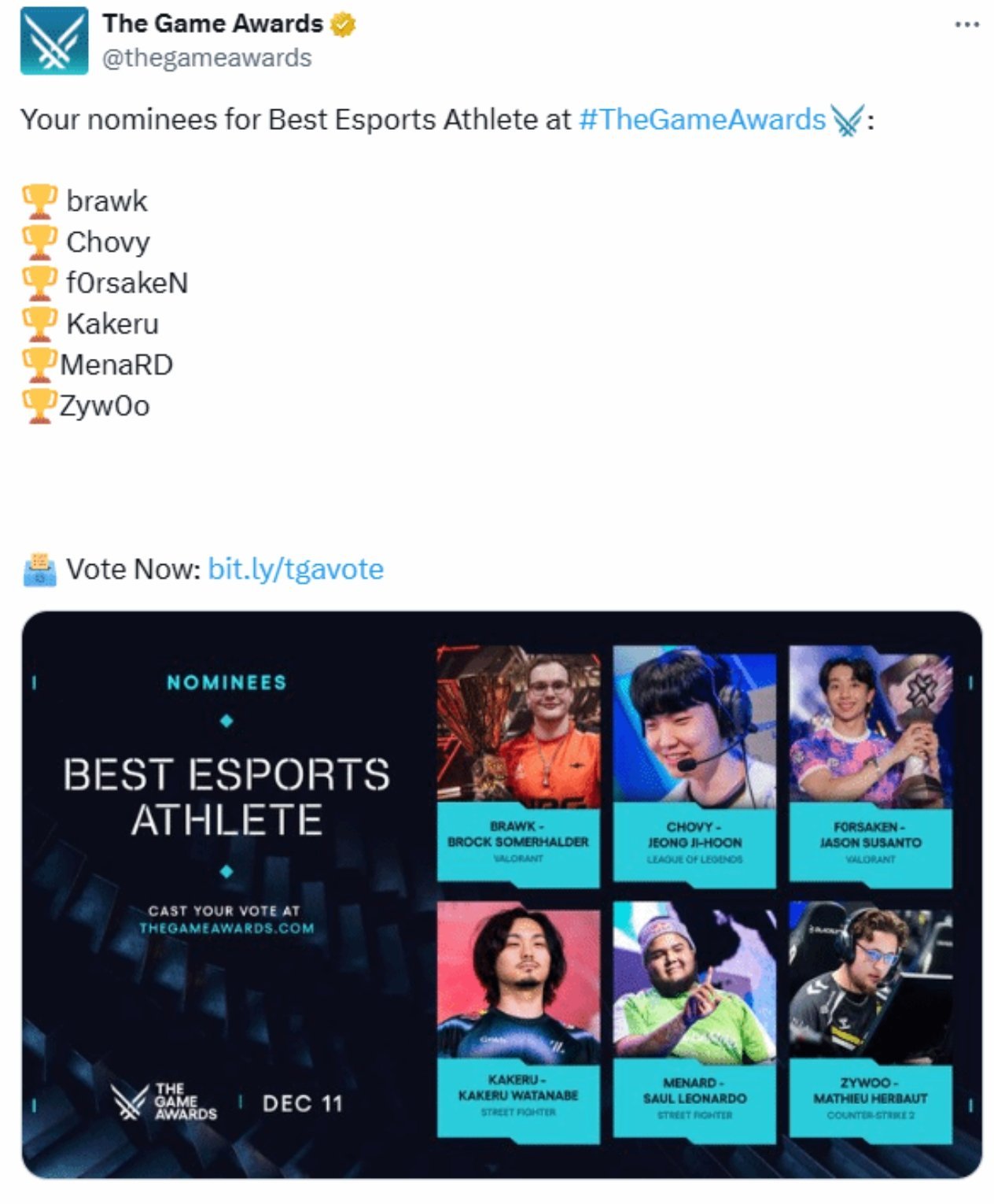 TGA 2025年度电竞选手提名名单今日公布,brawk(无畏契约)、Chovy(英雄联盟)、f0rsakeN(无畏契约)、Kakeru(街霸)、MenaRD(街霸)、Zyw0o(反恐精英2)六位选手入选。令人意外的是,英雄联盟传奇选手Faker与CS2超新星Donk均未出现在提名名单中。
