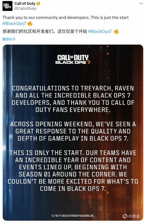 《使命召唤:黑色行动 7》首周末运营落幕,动视官方发布的感谢公告却史无前例未披露任何玩家数据,与往年“历史最高开局”、“销量破纪录”的高调庆贺形成鲜明反差,仅模糊提及 “游戏品质获良好反响”。
