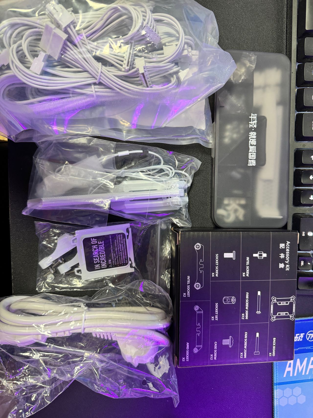 剩余的模组线,水冷剩余的Intel扣具,机箱剩余螺丝盒,原装电源线,原装扣具,显卡防尘塞,机箱显卡挡板以及机箱螺丝、WiFi增益天线等等。