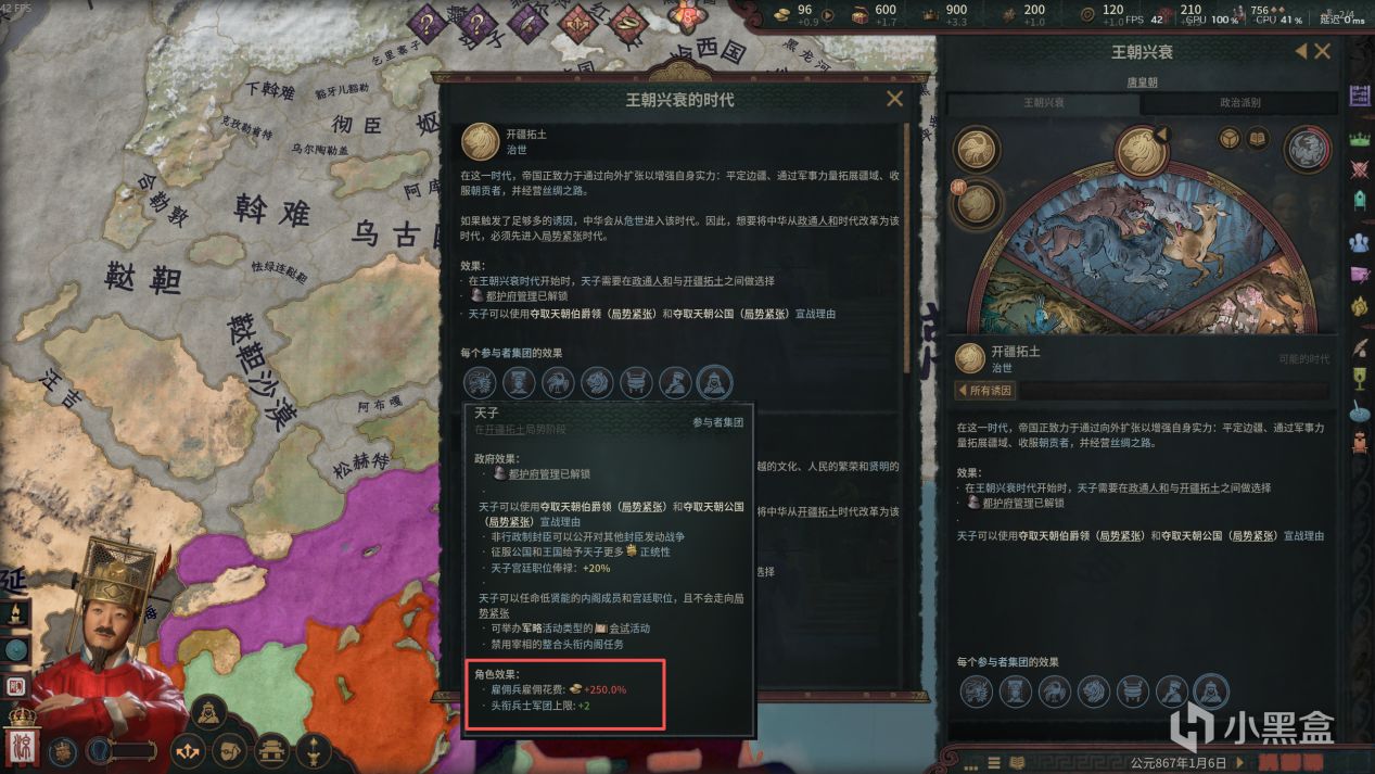 比如治世的“政通人和”时代有利于发展内政,“开疆拓土”时代有助于对外扩张(如减少雇佣兵花费和兵士维护费),危世的“新朝征服”时代降低封臣好感(毕竟设定上是外族征服),“局势紧张”时代减少国库收入,“群雄割据”时代天子失去天命,中华地区陷入吃鸡大赛。