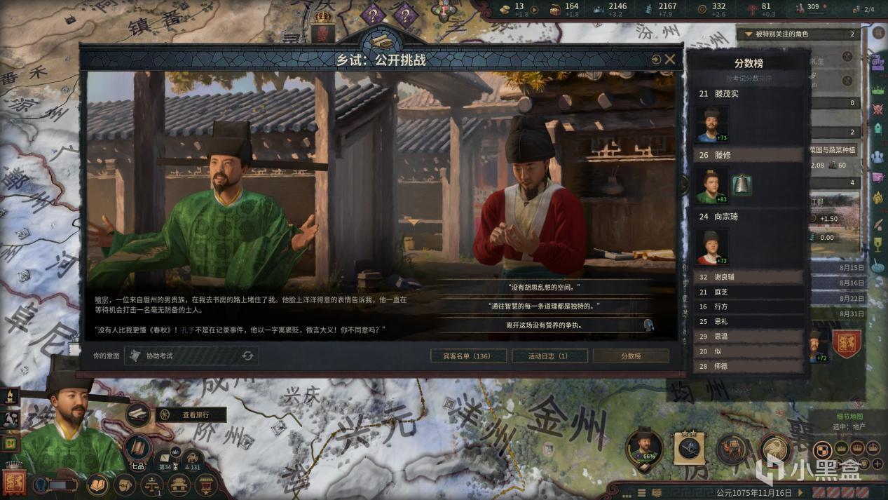 具体来说,每次无非都是这个人悬梁刺股、通宵达旦地复习,让自己压力爆表,那个人考试前给主考官送了礼物,另一个人觉得没有人比他更懂《春秋》。到了后来,我闭着眼睛都能根据需要的资源数目(无非就是贤能值和影响力两种嘛)和可承担的后果(比如为了获得科举优势买考试秘籍,代价是耗费大量金钱)来功利地、本能地选选项,失去了做题家模拟器的乐趣。