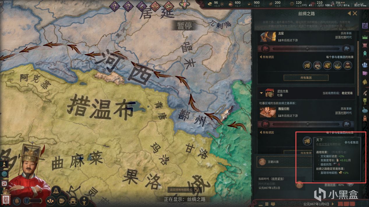 +玉龙dlc就有的王朝盛衰机制得到了保留和完善,并加上了丝绸之路新机制。可惜存在感不强切新手引导欠缺,但是看王朝盛衰的历史那里考证态度还算认真,给个好评鼓励一下