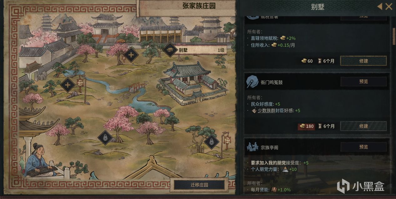 这是我最喜欢的新机制之一。庄园里可以修建或升级的建筑数量丰富,建筑下面还有各种设施(修建速度比建筑快得多,两个月就能完工),不仅可以提供金钱、虔诚、贤能值等重要资源,也能带来其他增益,比如增加民众好感(鸣冤鼓),加强个人朋党力量(宗族亭阁),提高家族成员考试初试分数(家庭文库),加快旅行速度(制图桌)等。