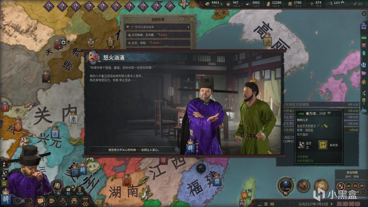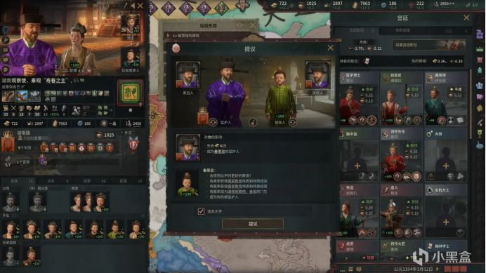 此外,角色更换门户的惩罚性太低了,导致左右横跳的现象时常发生(比如我第一个档里的秦观先后加入了三个派别),有点出戏。个人建议是加强朋党派别与血缘和门生关系的绑定,适度提高改变门户的惩罚(比如降低原先派别角色的好感,降低虔诚、贤能值等)。