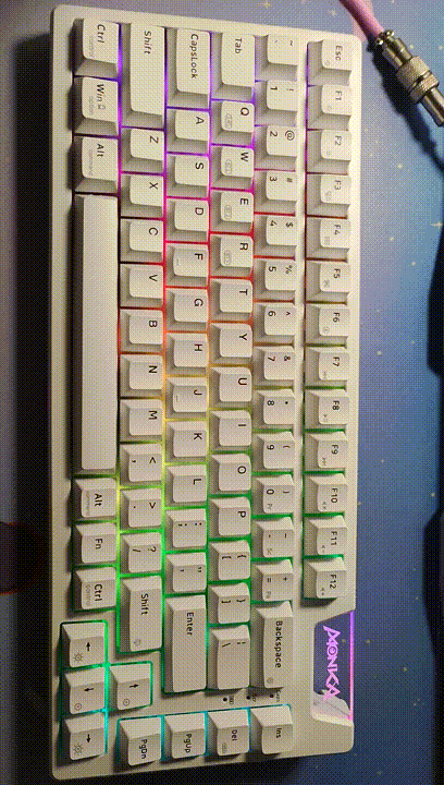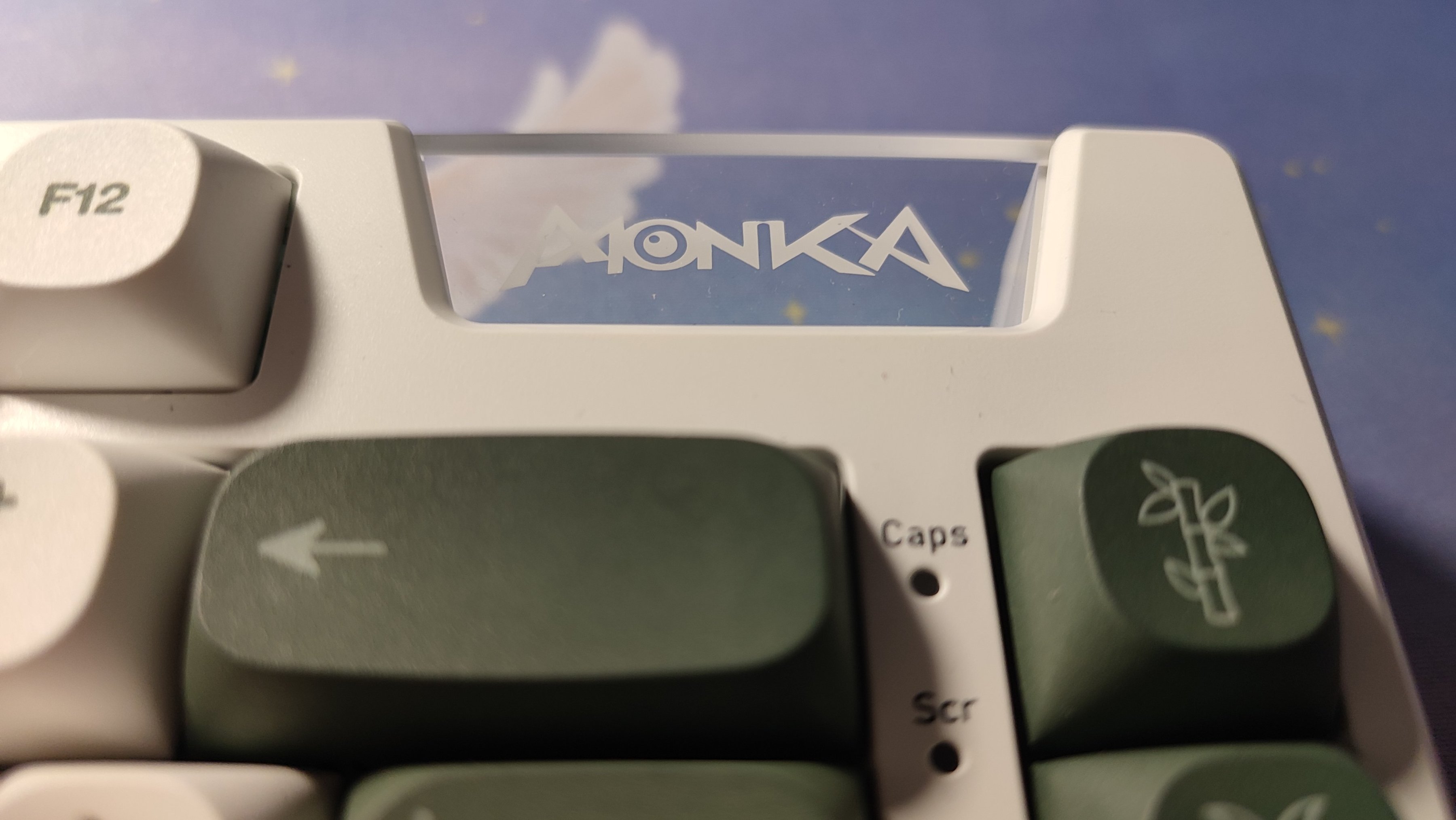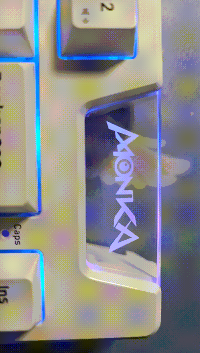 想必许多人购买魔咖的键盘也是为了右上角的这个可自定义的亚克力铭牌,实际使用下来感觉确实不错,除了在打游戏的时候看不到。不过在日常宿舍(公司里应该没人用这样的键盘吧)里舍友看到一个带铭牌的键盘肯定会惊呼卧槽;并且这个铭牌支持定制,你可以将你的需求发给客服,仅需加亿点点预算。并且这个铭牌旁边有个独立的灯光,打开的时候字符会映出来灯光颜色,无线使用时担心太过耗电也可以单独关闭,并且在最新固件中,灯光也支持增加/降低亮度&炫彩和单色灯光调节。