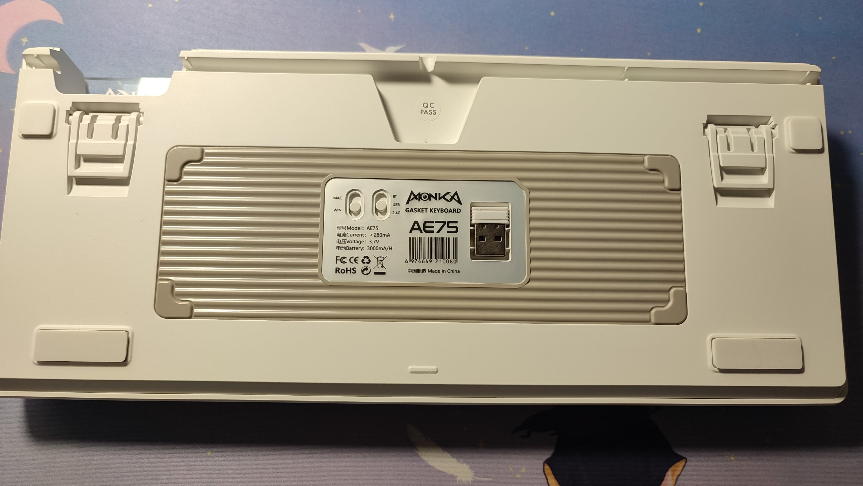 除了这块铭牌,从背面还能看到一个三向出线口、两个二段式的脚撑以及五个防滑脚贴,这些都几乎是优秀键盘的标配了,这里就不多说了。