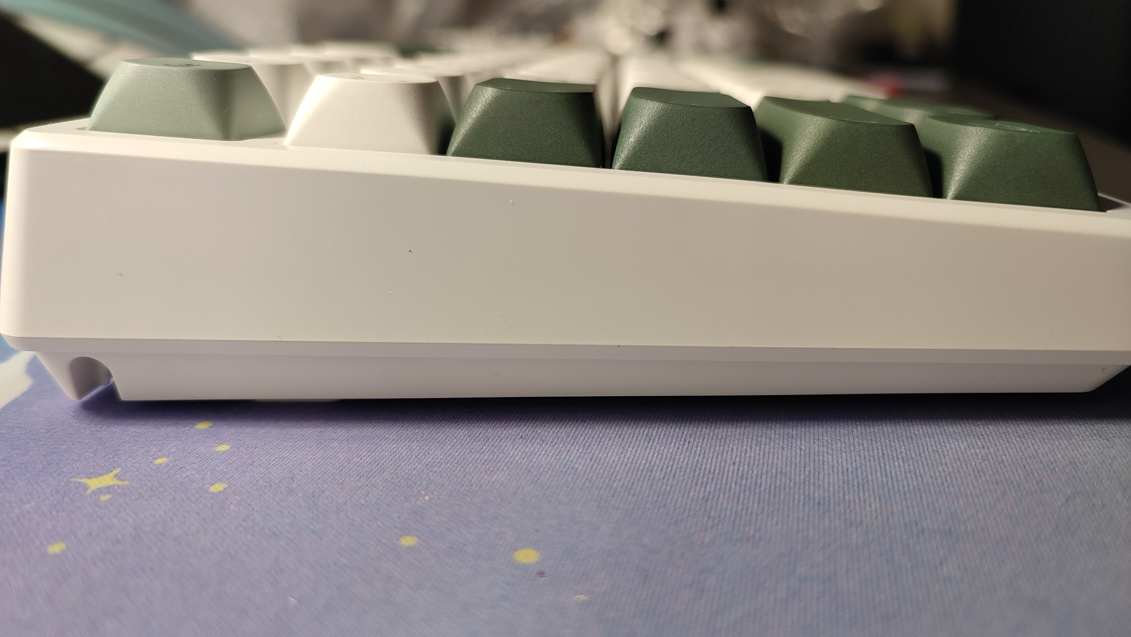 侧面能看到做了一个坡度处理,在不开脚撑的情况下也能在输入的时候有一个较为舒服的输入姿势,并且在顶部可以看到有倒角处理:这个处理是整个键盘四周都有的,可以有效防止尖角刺伤手或其他部位。