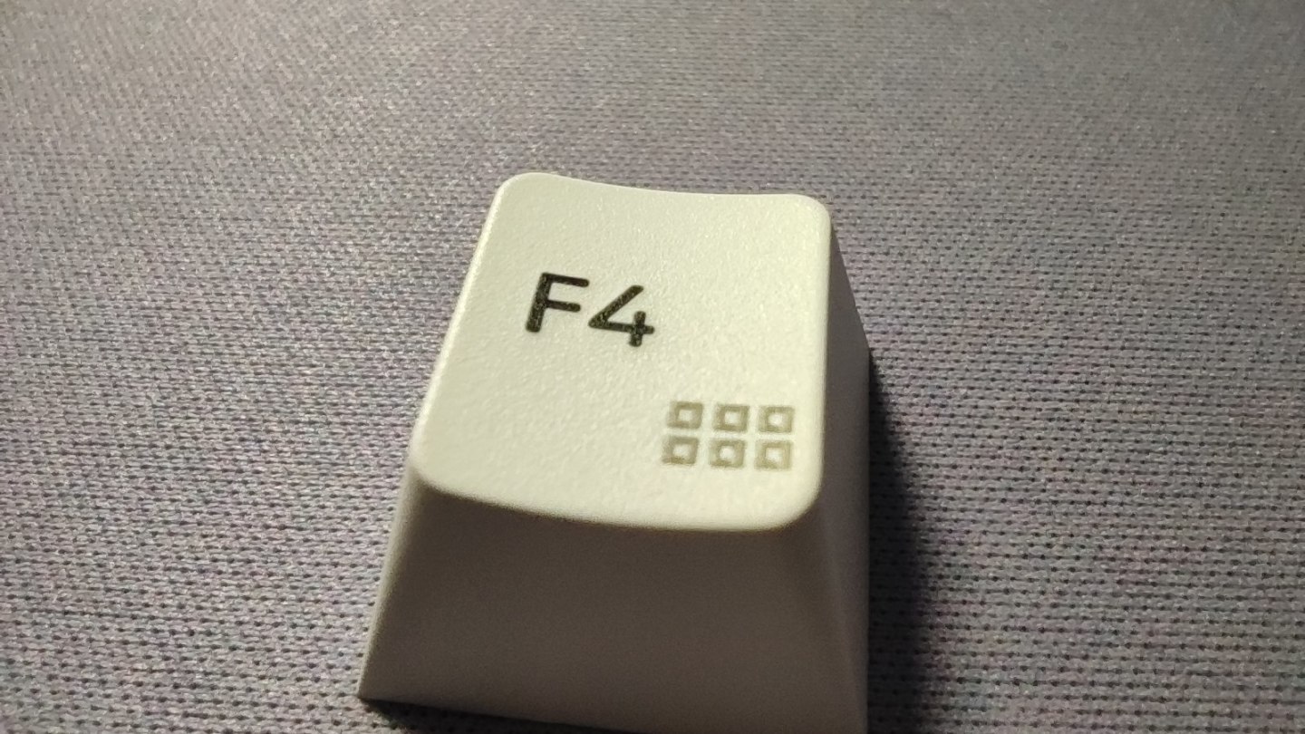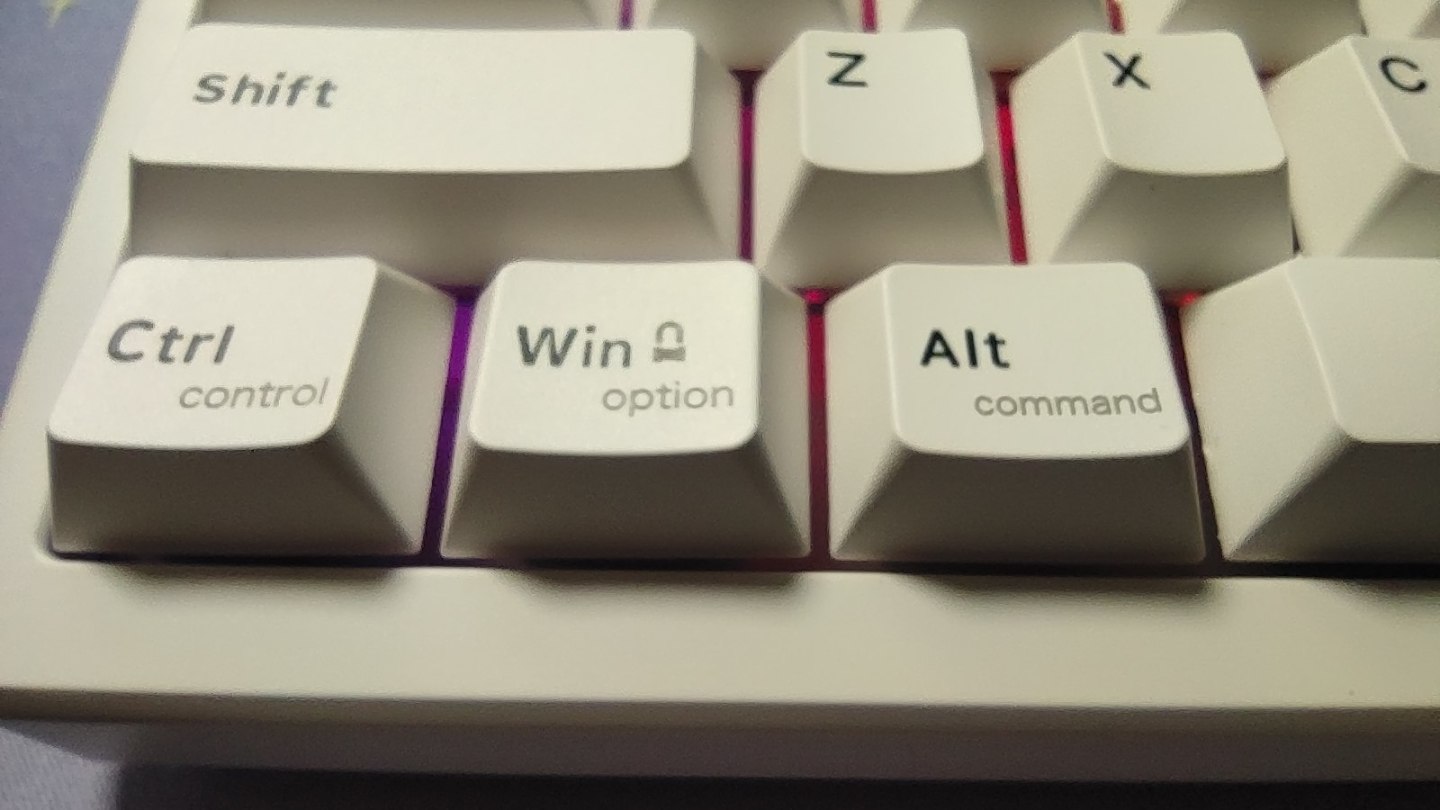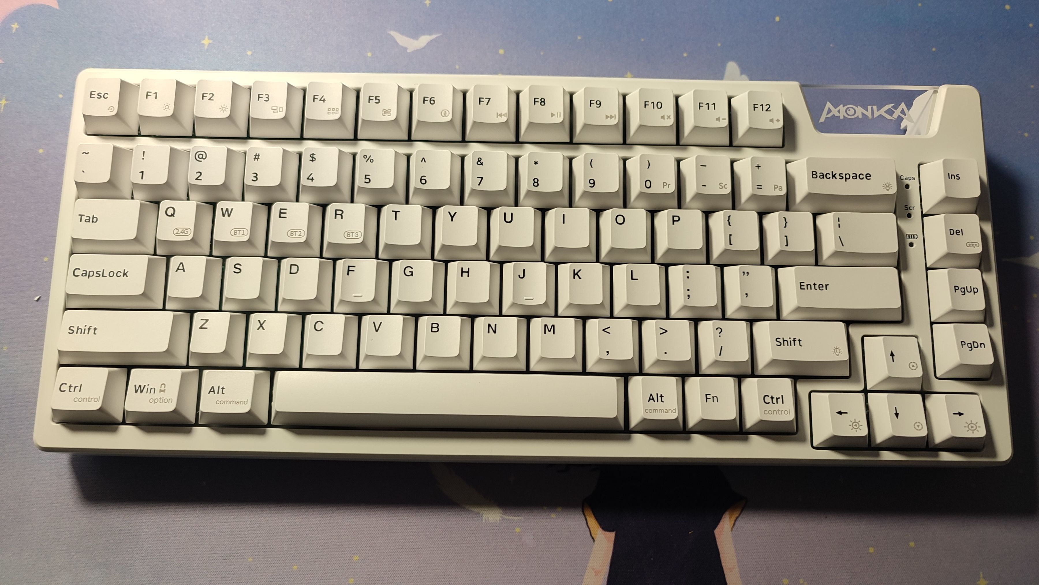 原装键帽用的则是PBT材质键帽,采用的二色注塑的工艺制成,原厂(CHERRY)高度,并且无明显水口(我没看出来)。右下角通过激光刻印印上了fn快捷键效果,对于记不住按键效果&懒得看说明书的(比如我)人来说很赞。同时因为支持mac模式,一些按键也印了mac端对应的按键,比如: