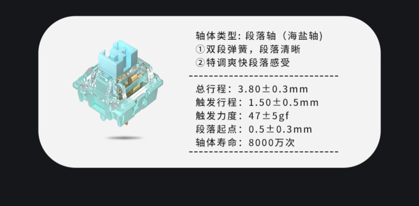 我选择的是海盐轴,是一颗提前大段落轴体,不熟悉机械键盘圈的盒友(或者不熟悉国产轴体的盒友)应该不清楚这是什么轴体,其实就是在段落轴的基础上将轴体的段落感提前,使其变成一种独特于樱桃经典四轴之外的手感,被称作为提前大段落轴(类HP轴)。简单来讲,就是老式的薄膜键盘手感,参考下图: