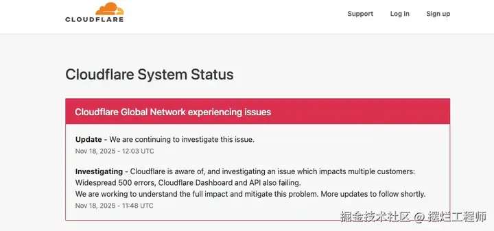 但是我马上一搜索发现,2025.11.18 21:56,也就是前几分钟的样子,Cloudeflare 挂了!原文来自掘金@摆烂工程师。 看看他怎么讲这一次全球事故吧!