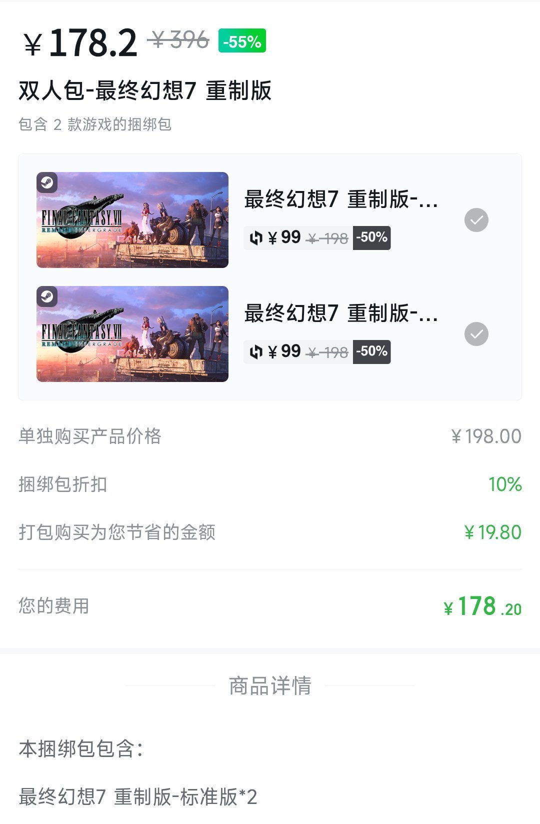 《最终幻想7 重置》双人捆绑包:¥178.2