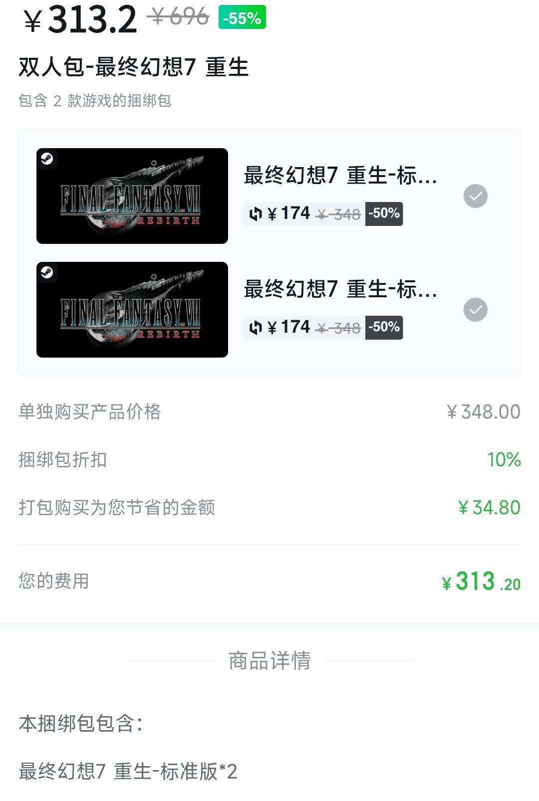 《最终幻想7 重生》双人捆绑包:¥313.2